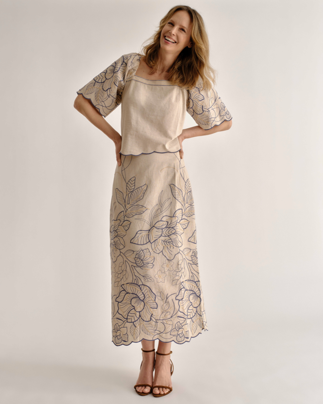 Crafted in natural cotton linen, the Bryn top features a waterfall embroidered half sleeve and embroidered scalloped hem.