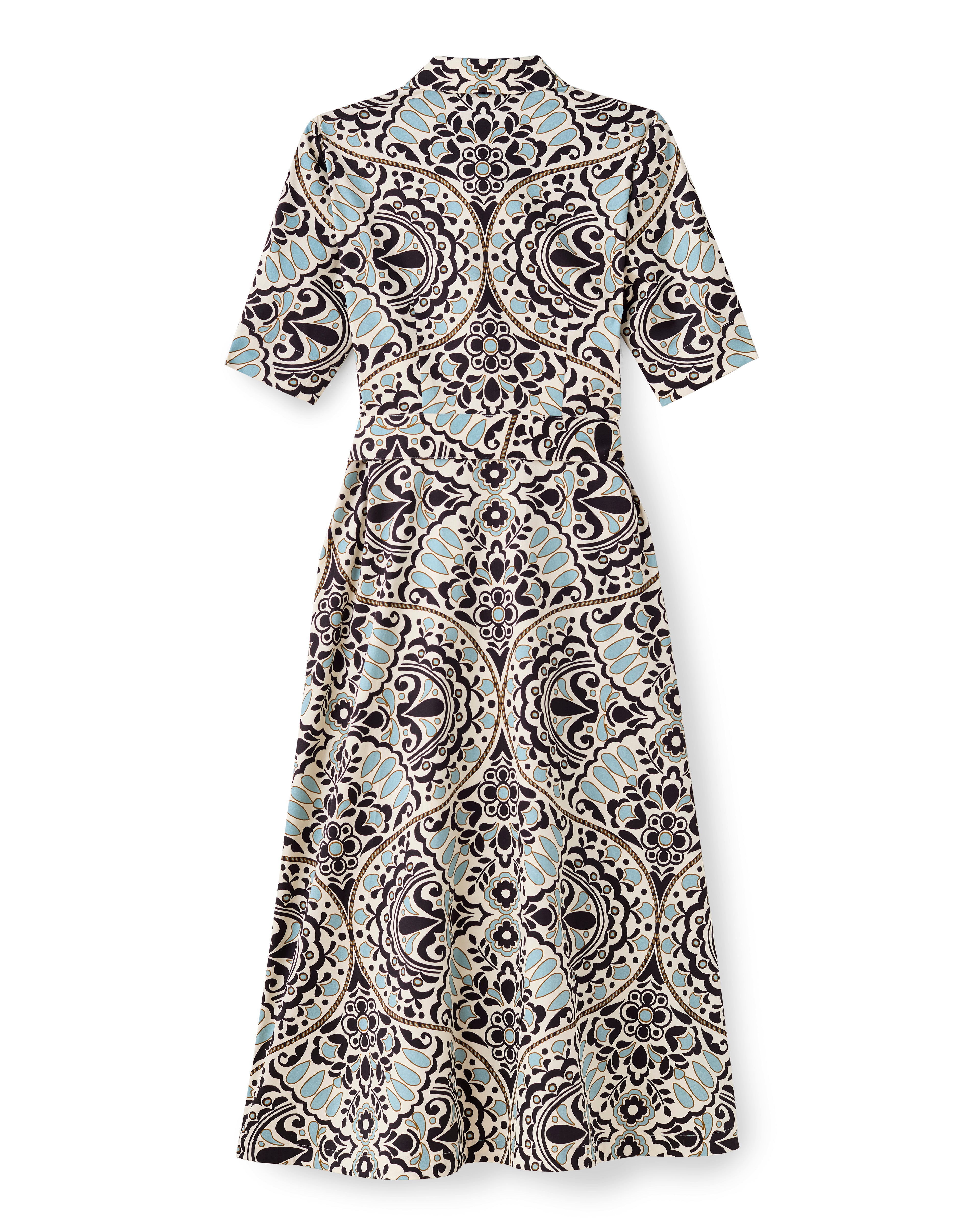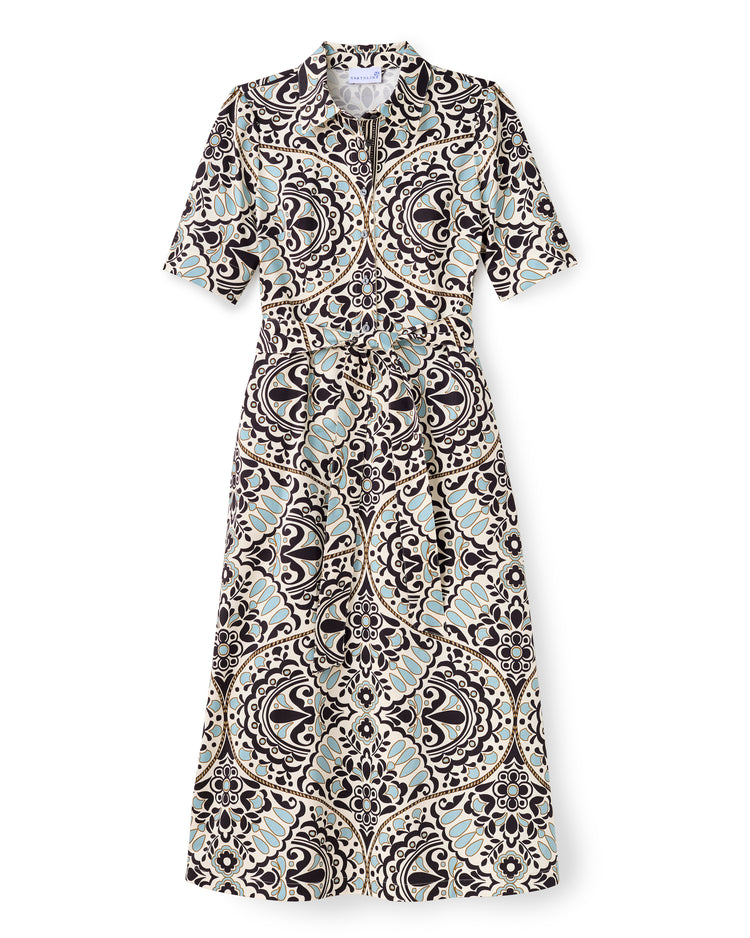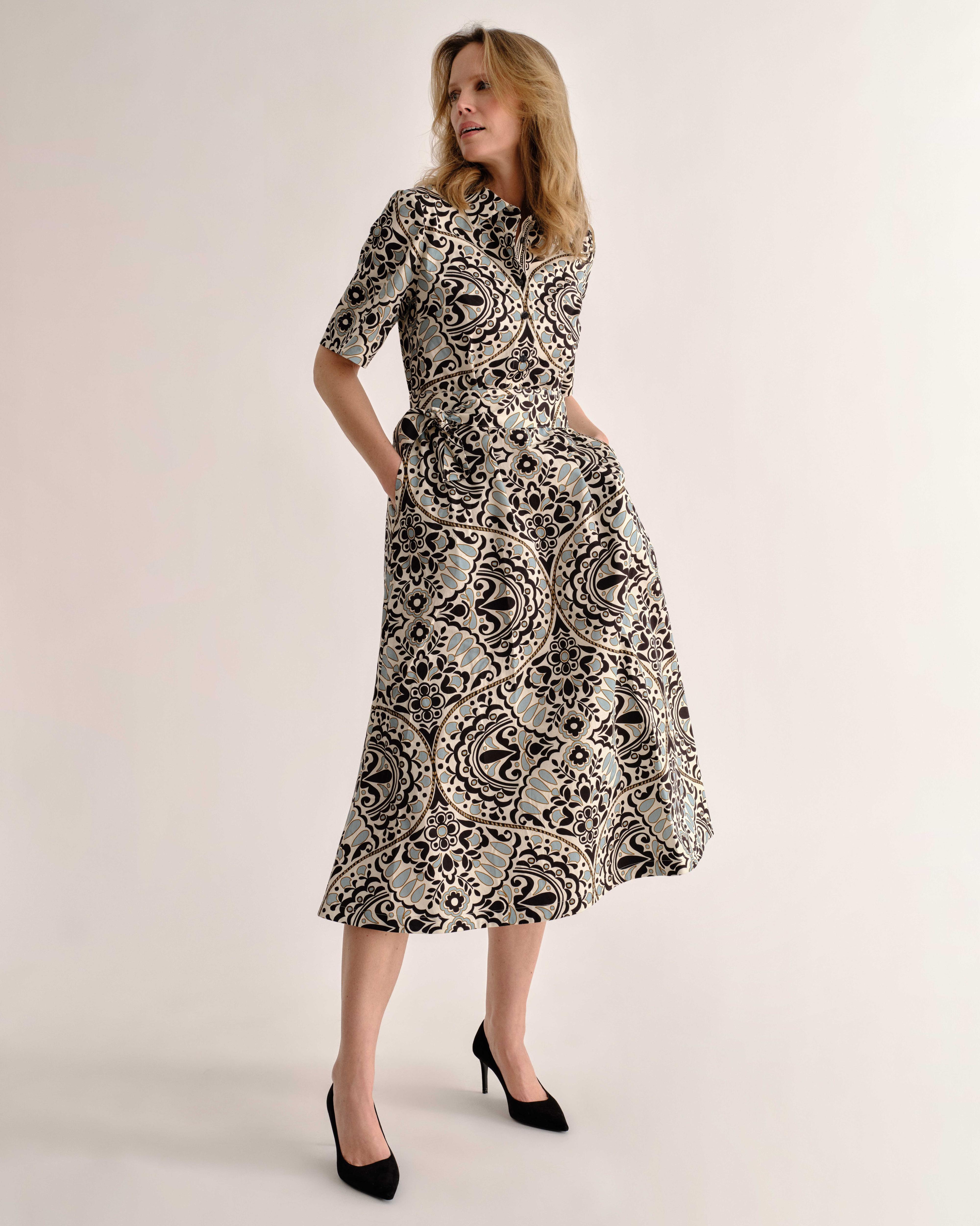 Coastal town charm echoes through the Cara dress—classic, relaxed, and endlessly wearable, with engineered print and tailored lines balancing structure and ease.
