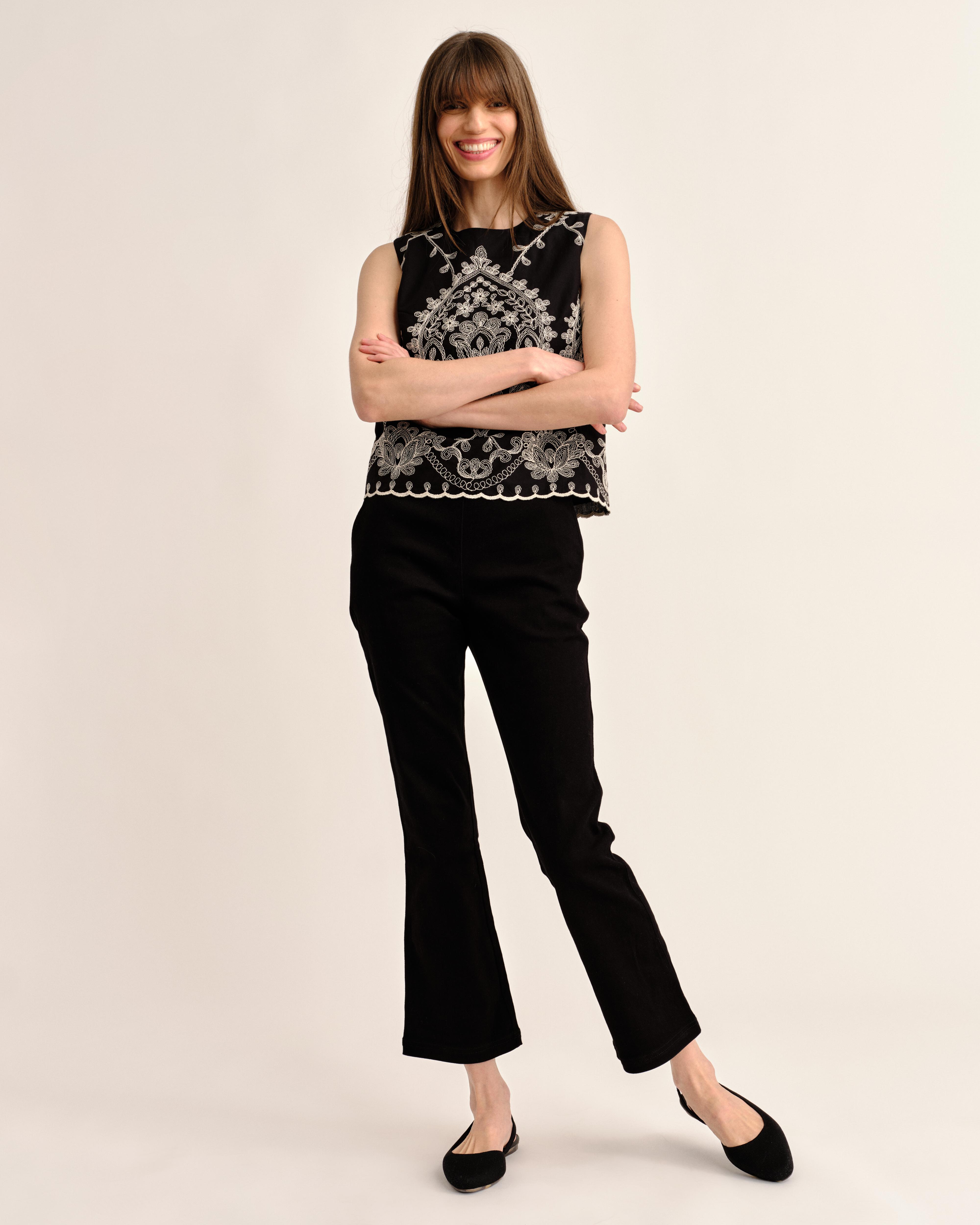 Sunlight filtering through early spring florals defines the Linda top—bright, confident, versatile, bringing warmth and texture to even the simplest pairings.