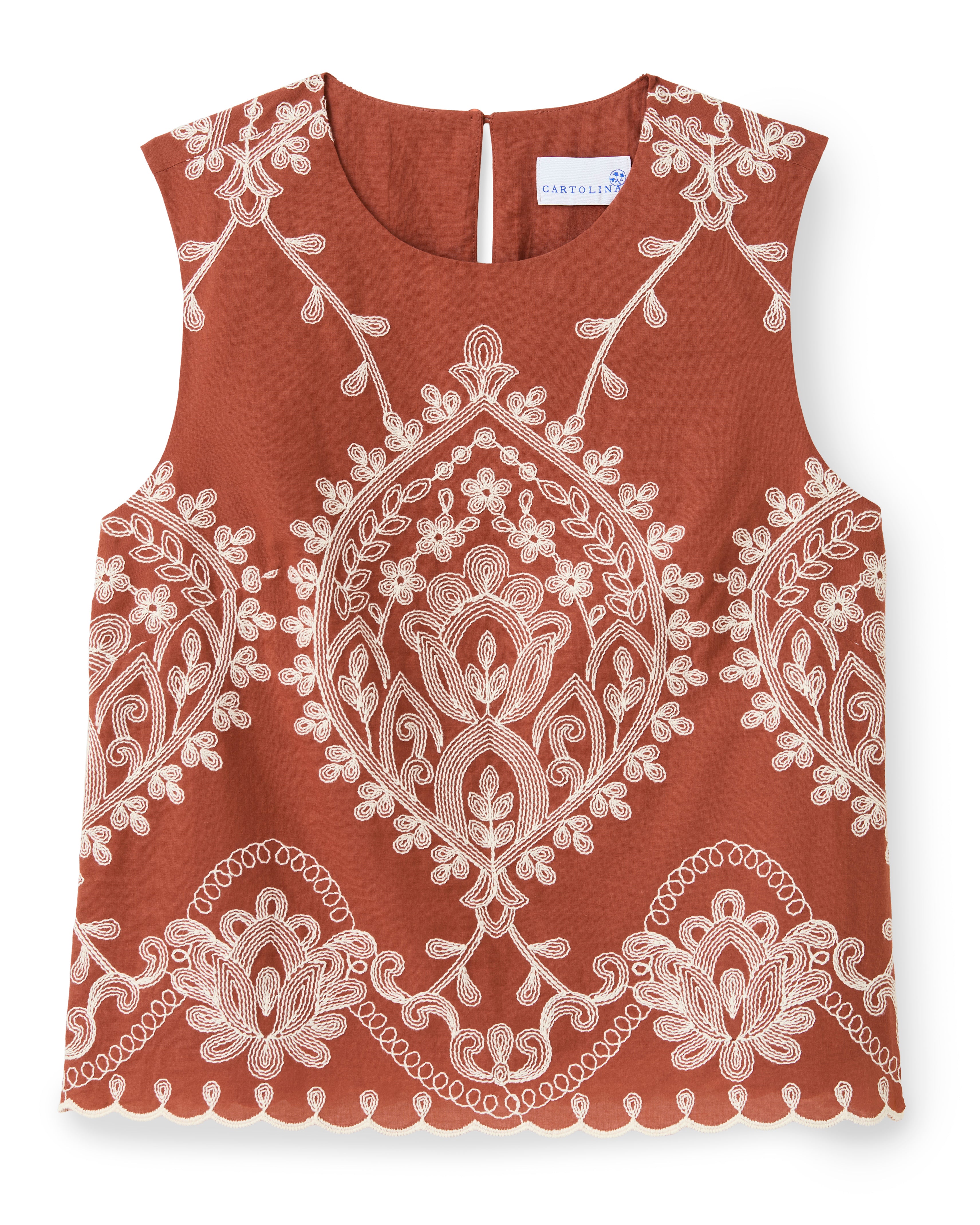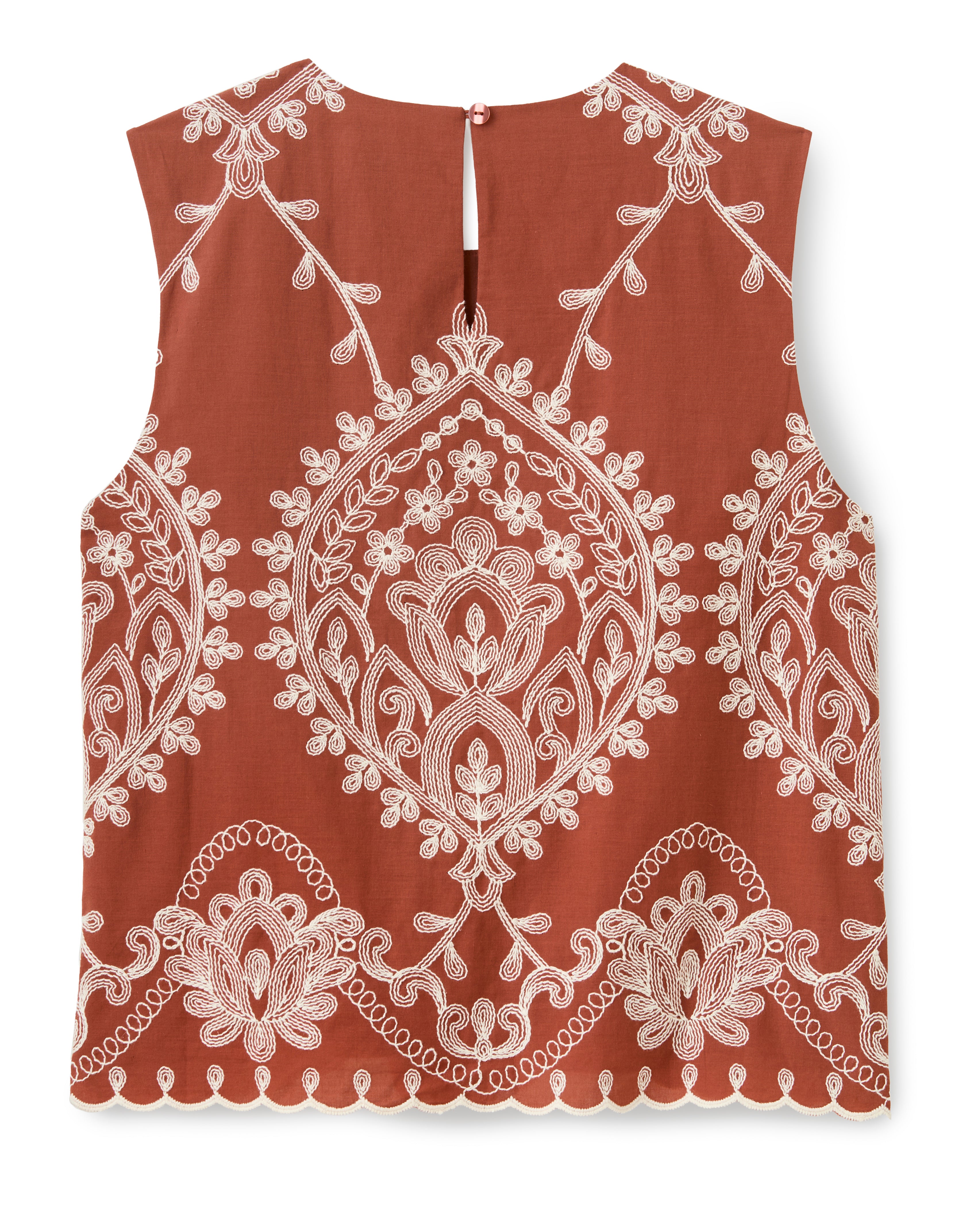- Embroidered scalloped hem and back keyhole closure finish the look