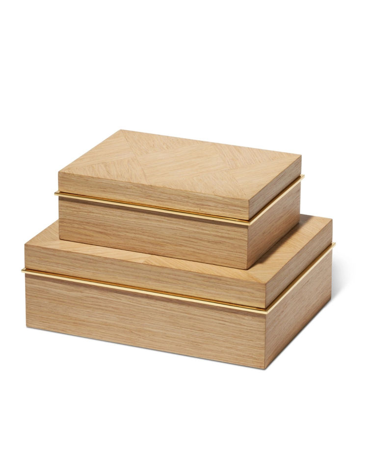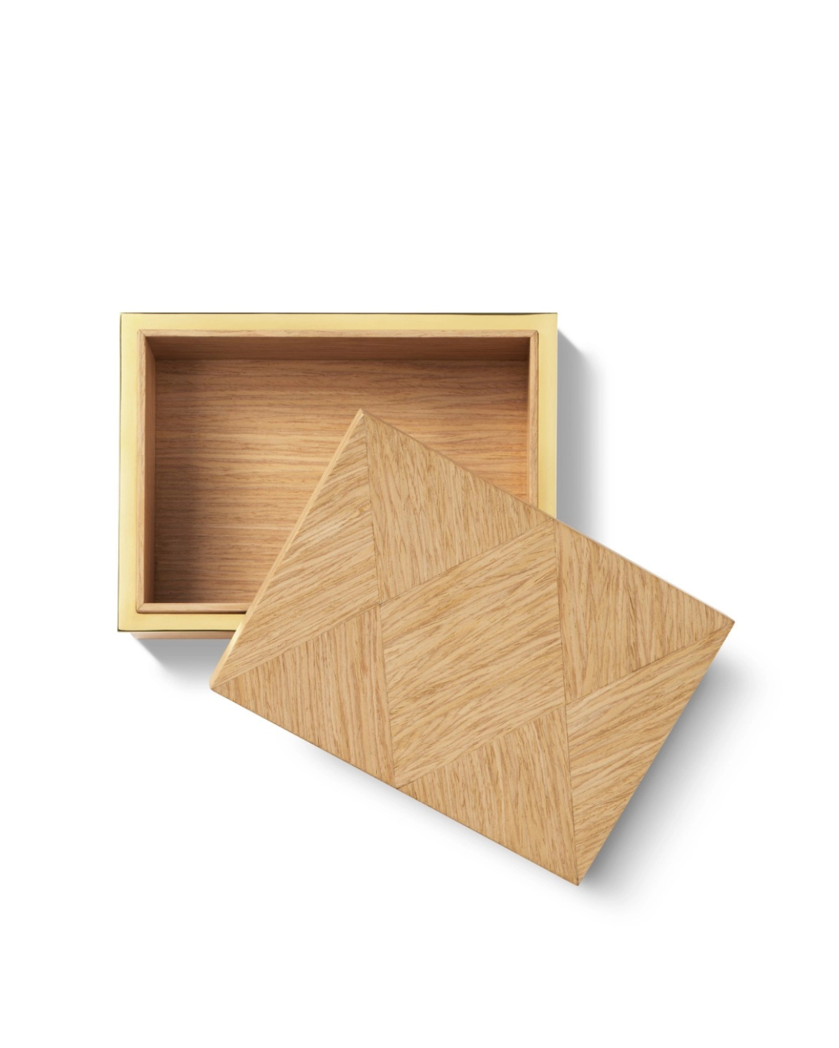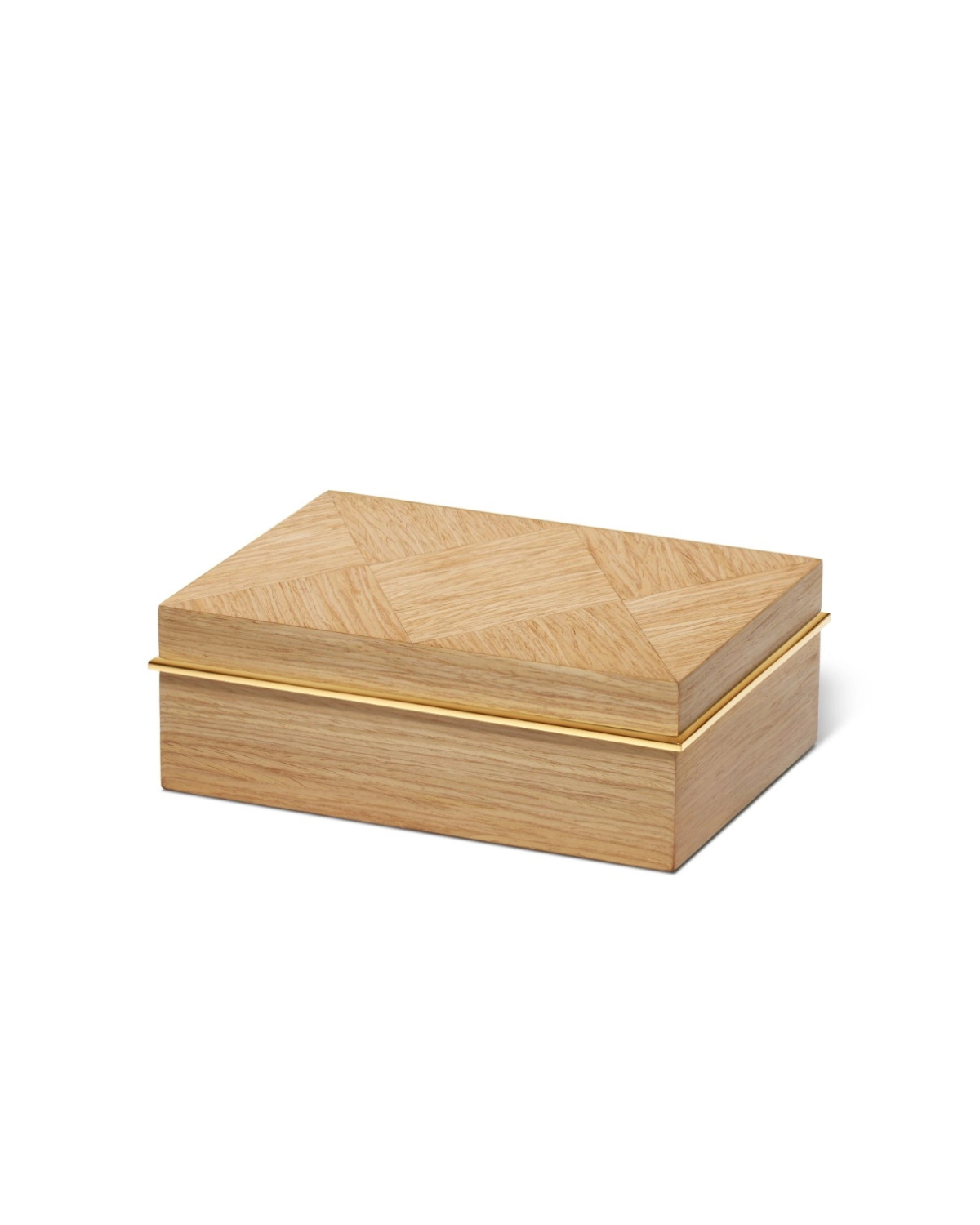 Inspired by Art Deco-style wood marquetry, the Marcello box is crafted in light European oak with an oiled finish, enhanced with brass edging, which give it a contemporary twist. It adds a fresh, stylish look to a desk and keeps small items, from pens to envelopes, beautifully organized.