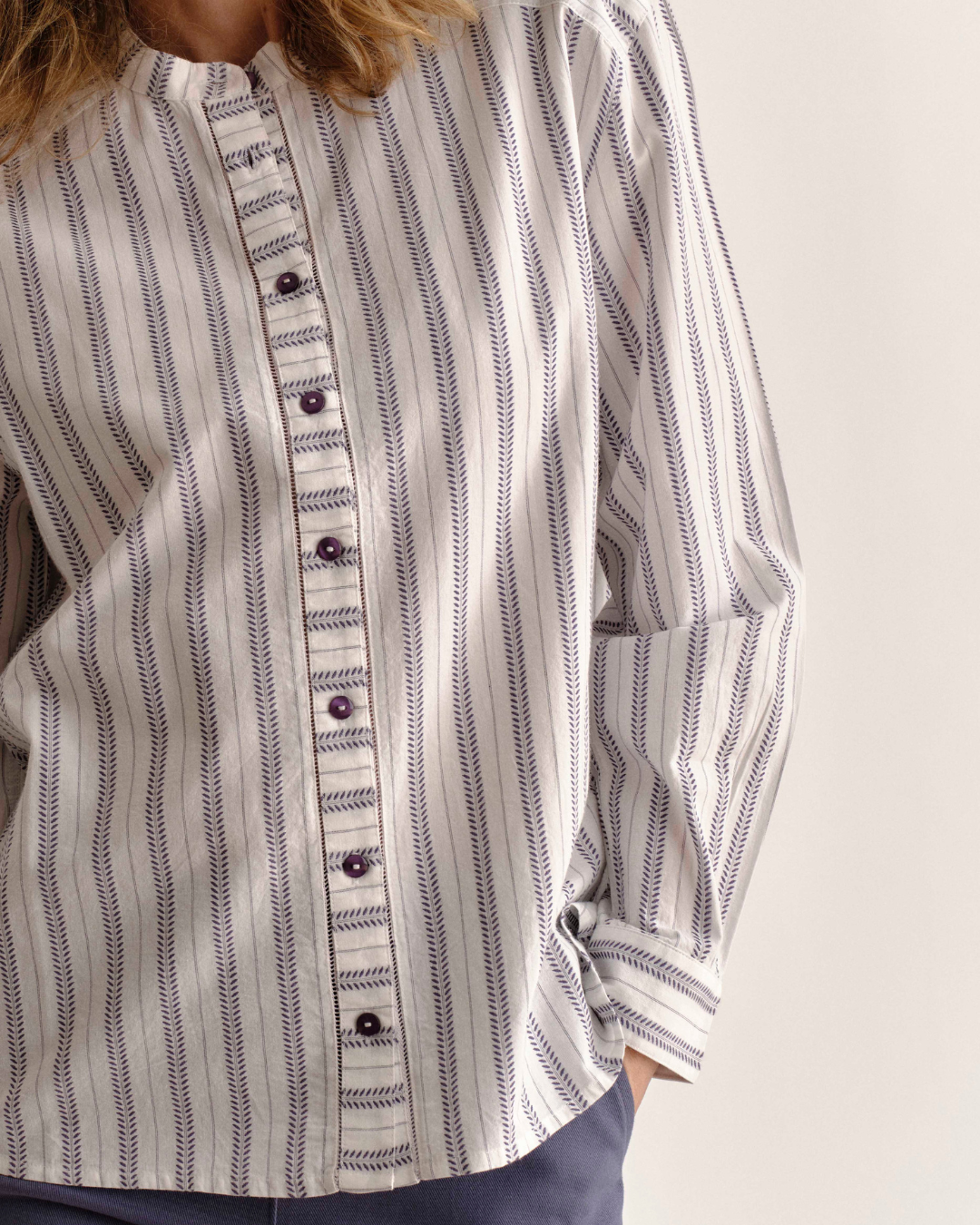 - Mandarin collar with button-front contrasting stripe placket