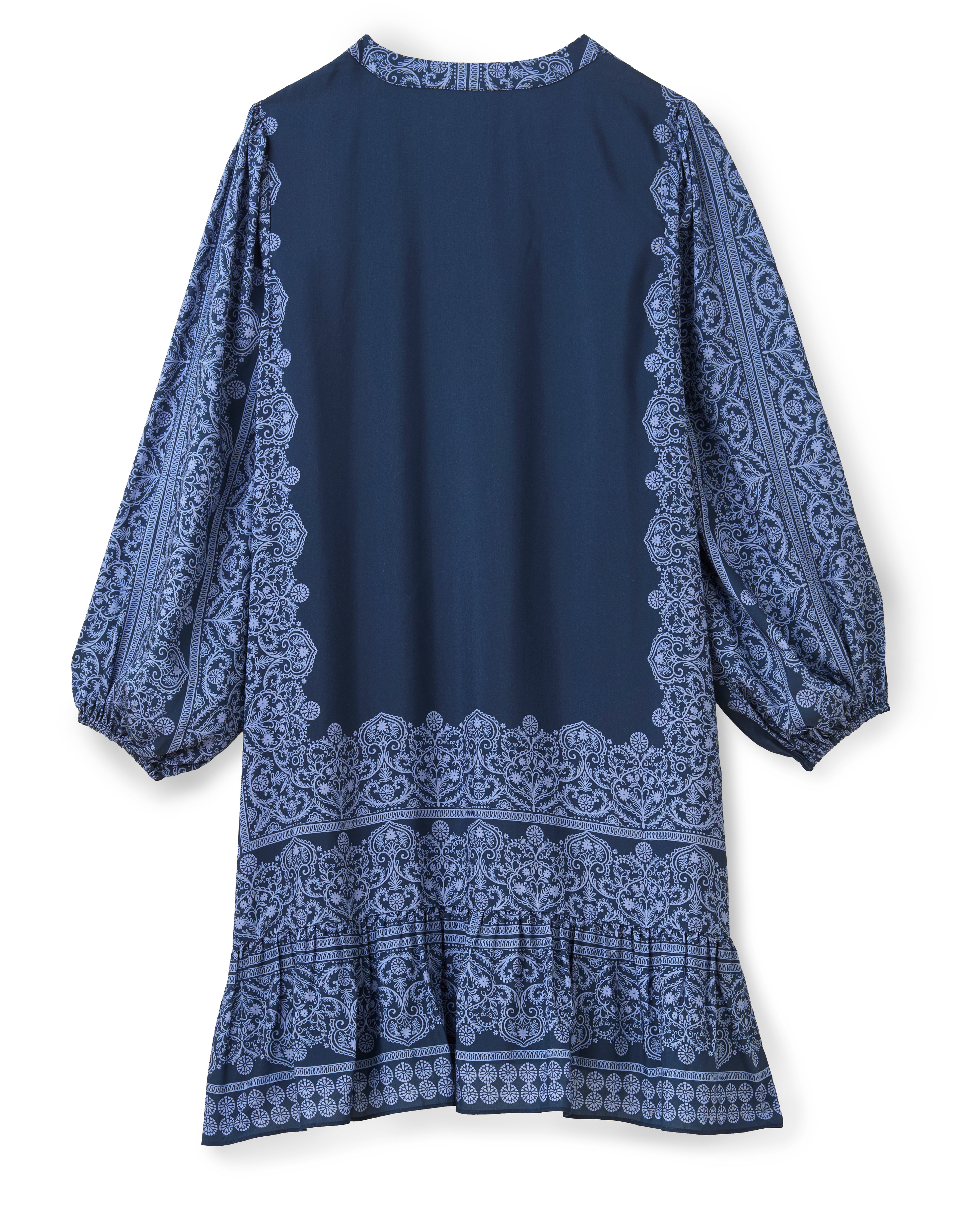 Our cult favorite short dress, Bonnie, now has elasticized bracelet-length full sleeves. This engineered printed silk blend dress is Carmel Trellis print can be worn with or without its two-print self-tie belt.