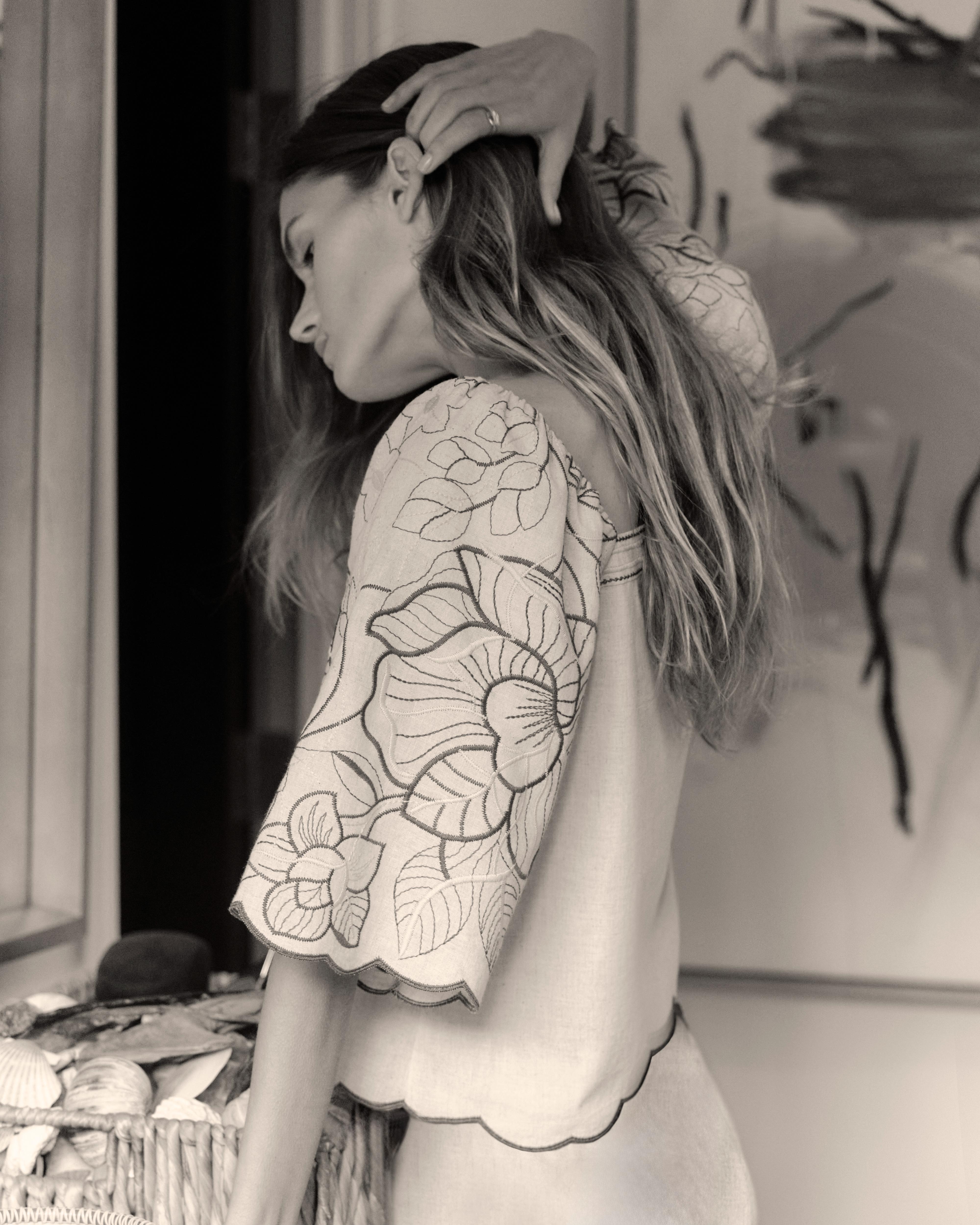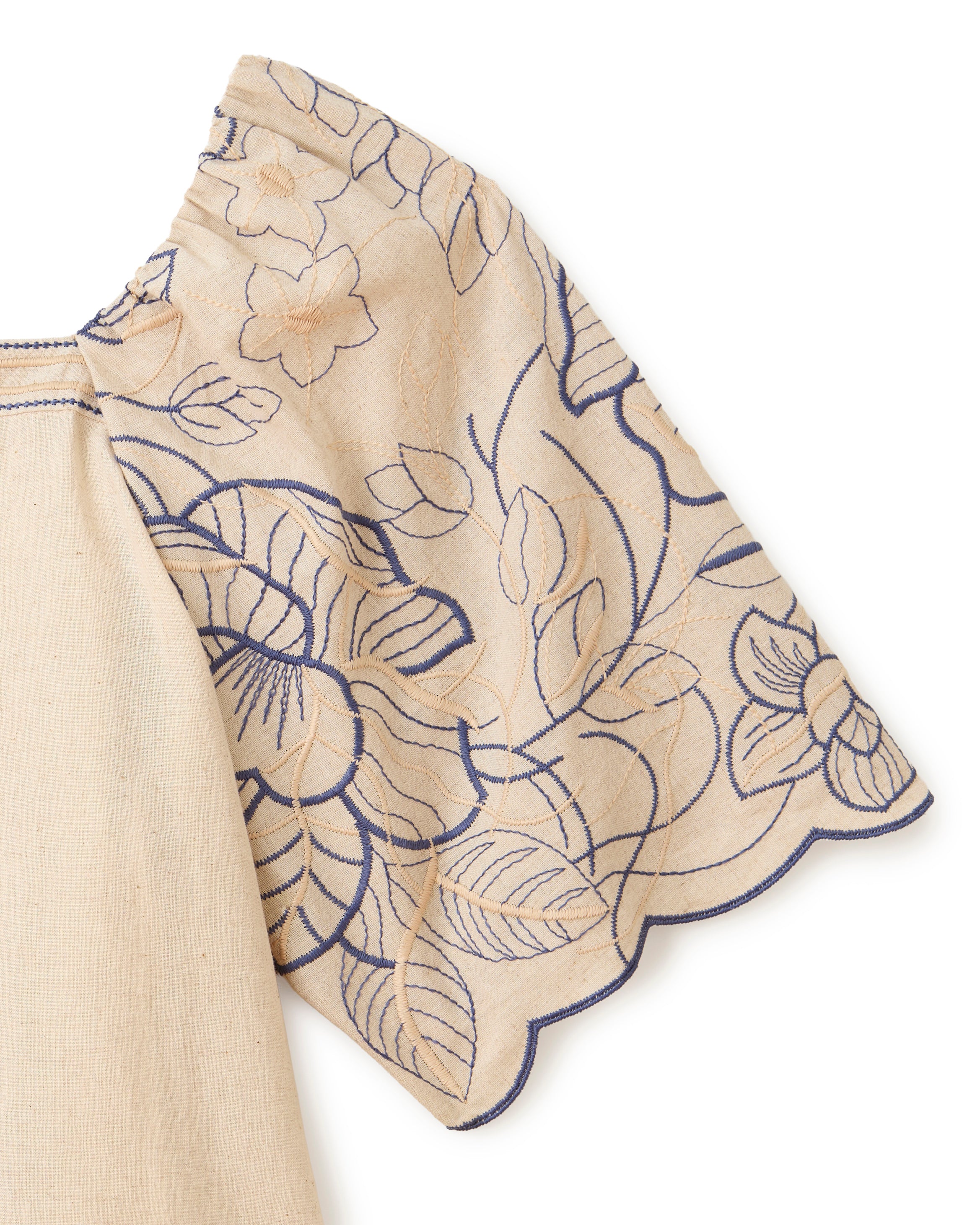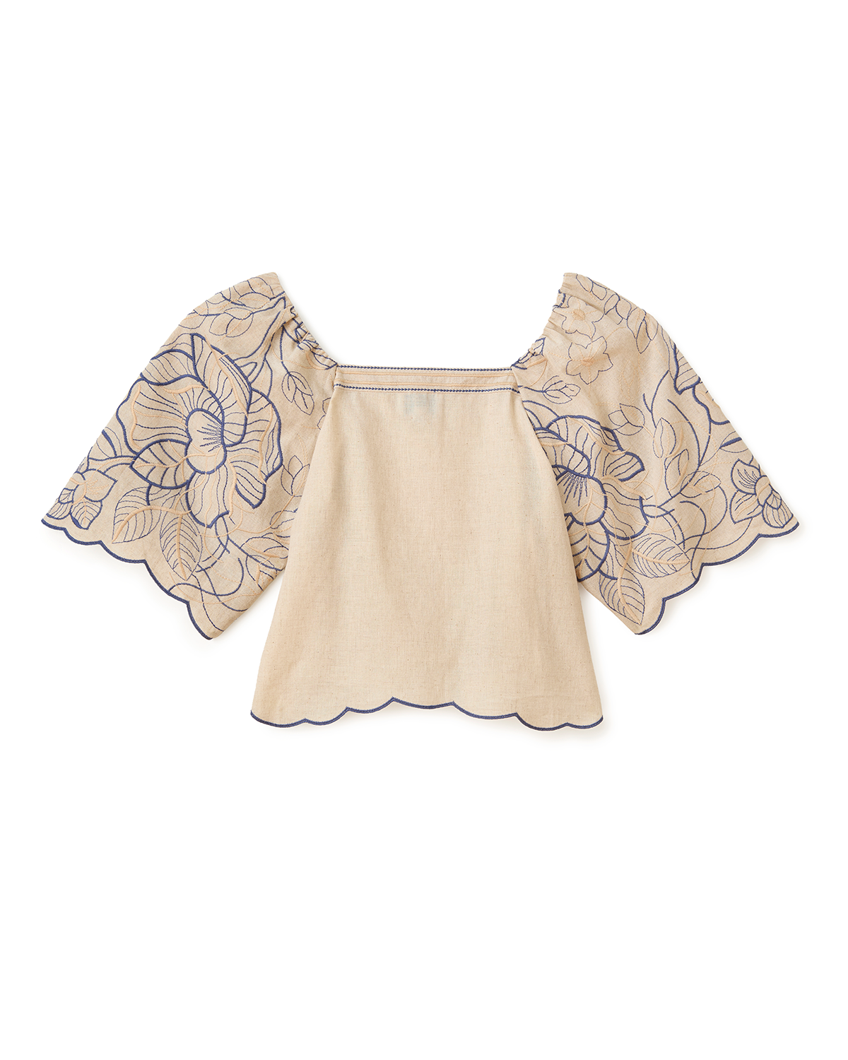 Crafted in natural cotton linen, the Bryn top features a waterfall embroidered half sleeve and embroidered scalloped hem.