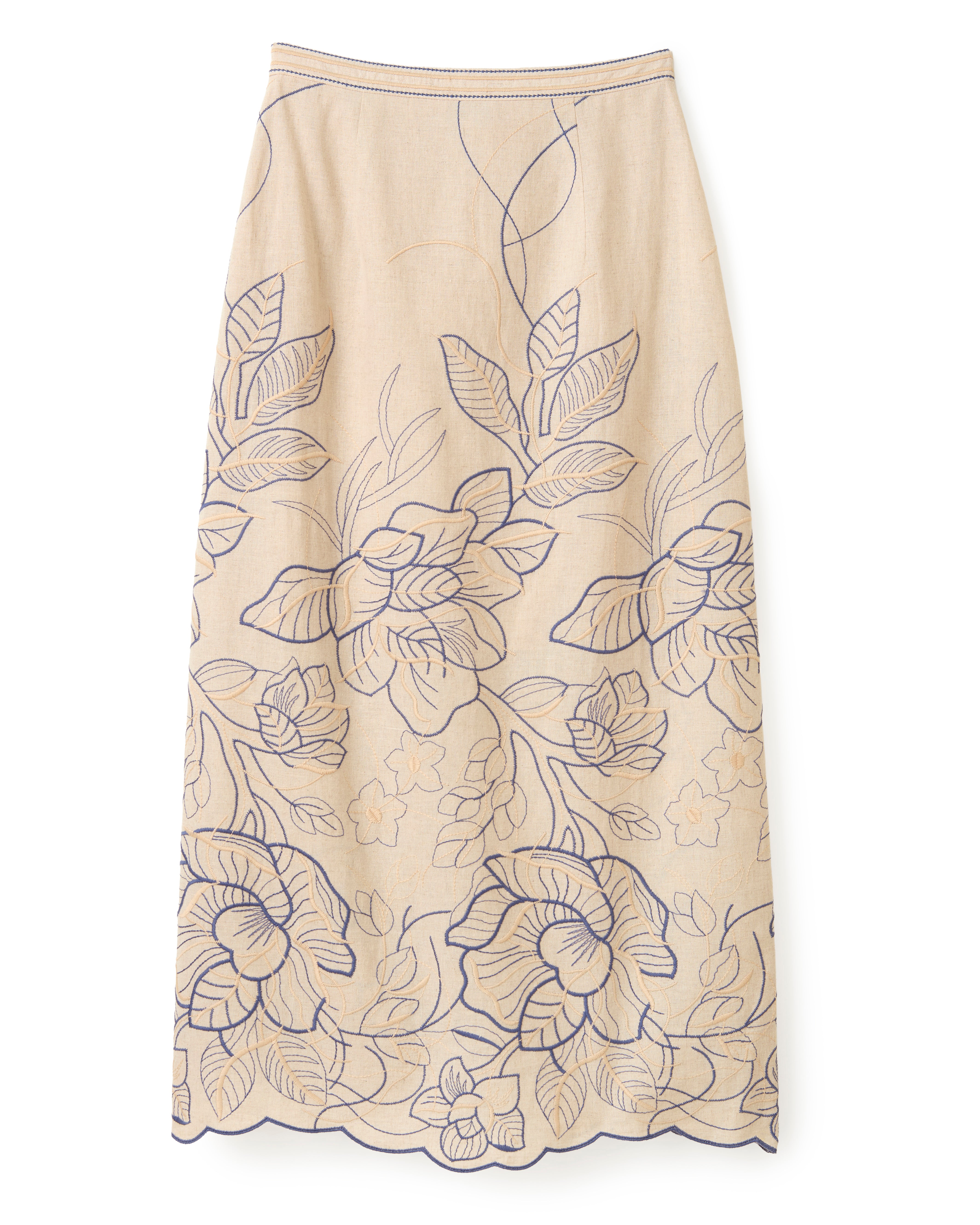 Designed with an uneven scalloped edge, this embroidered cotton linen straight midi skirt is the perfect transition skirt from winter to spring.