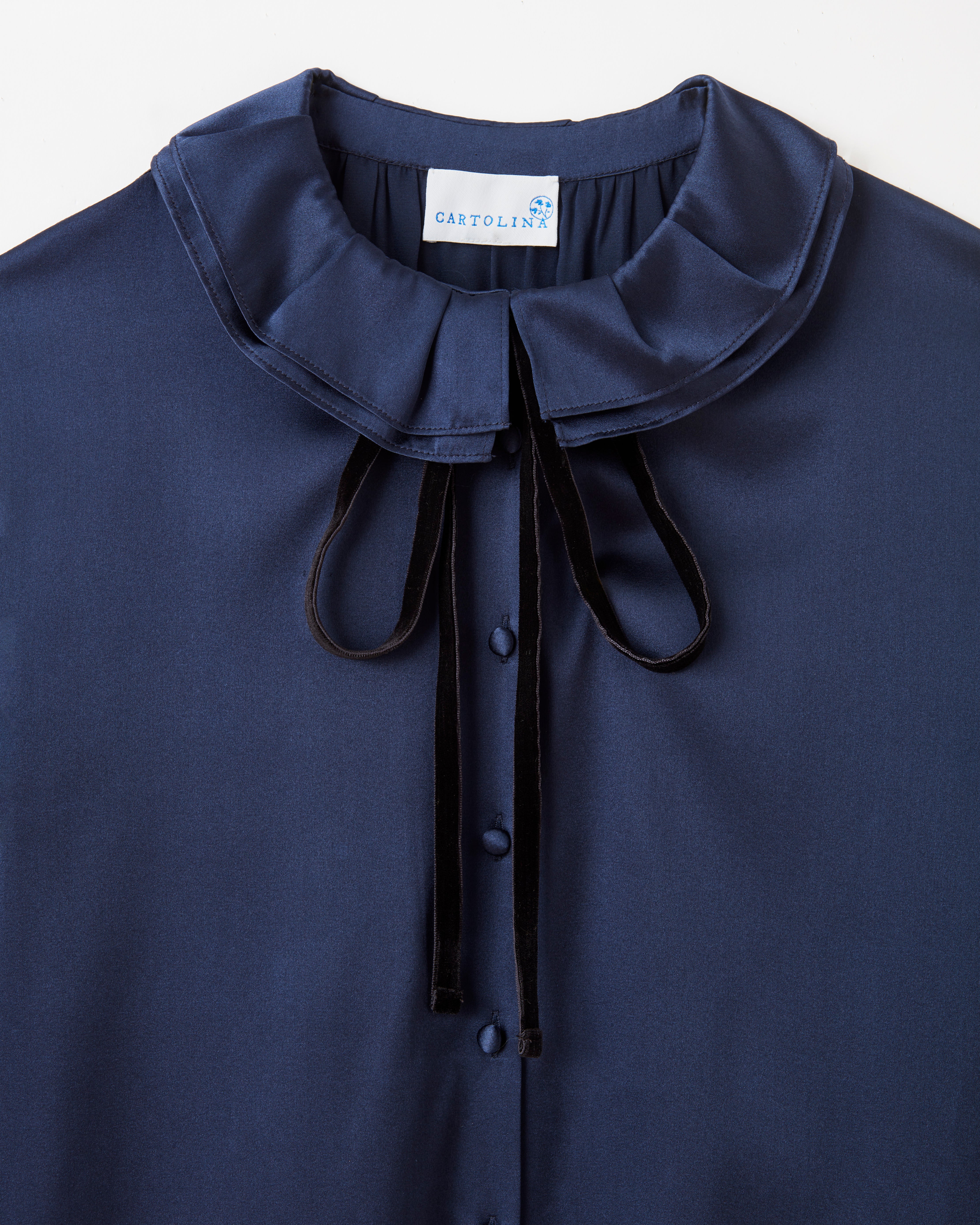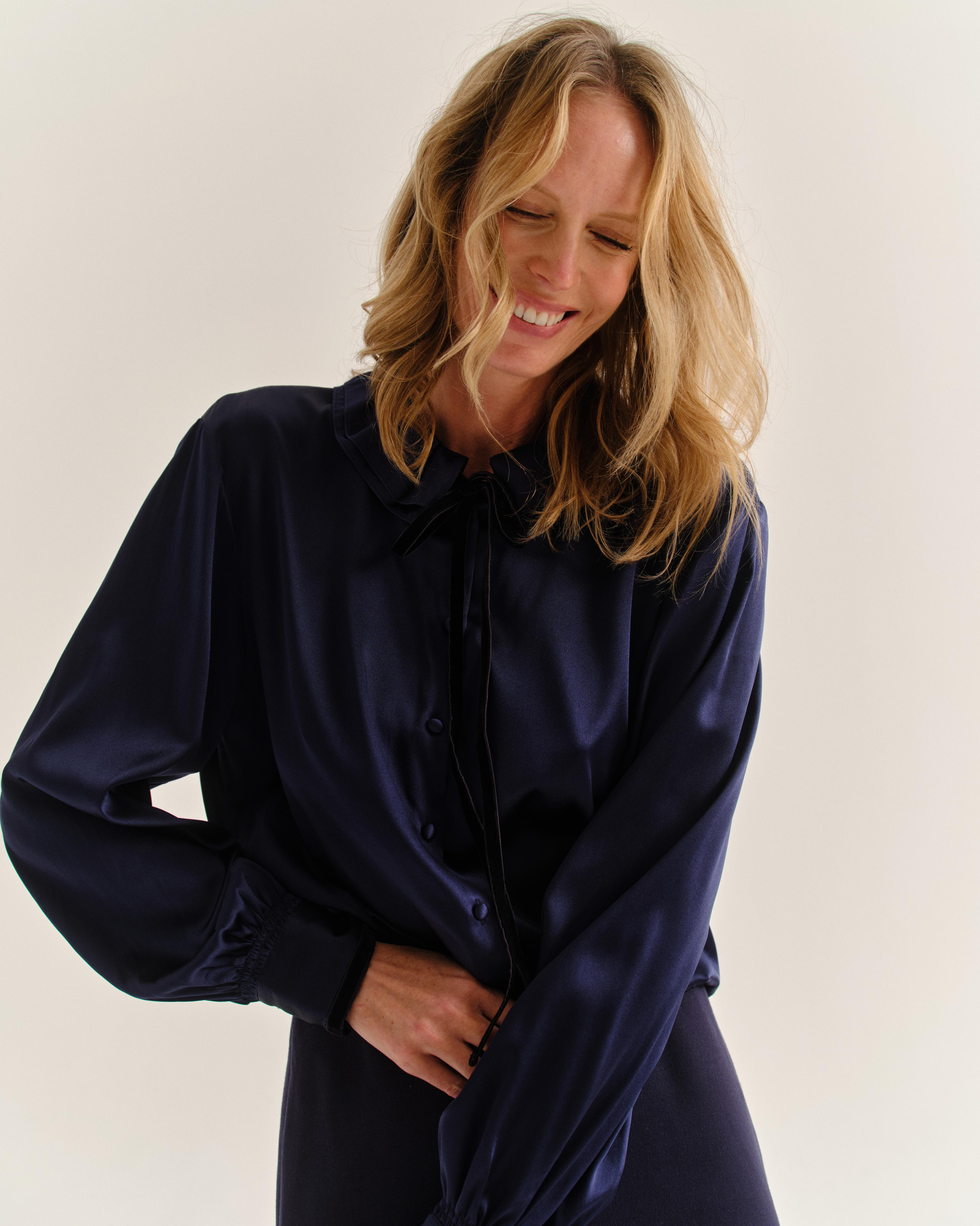 Perfect for evenings that call for a chic touch, this midnight silk blouse is finished with velvet ribbon and cascading ruffles to bring timeless femininity to candlelit dinners and holiday gatherings alike.