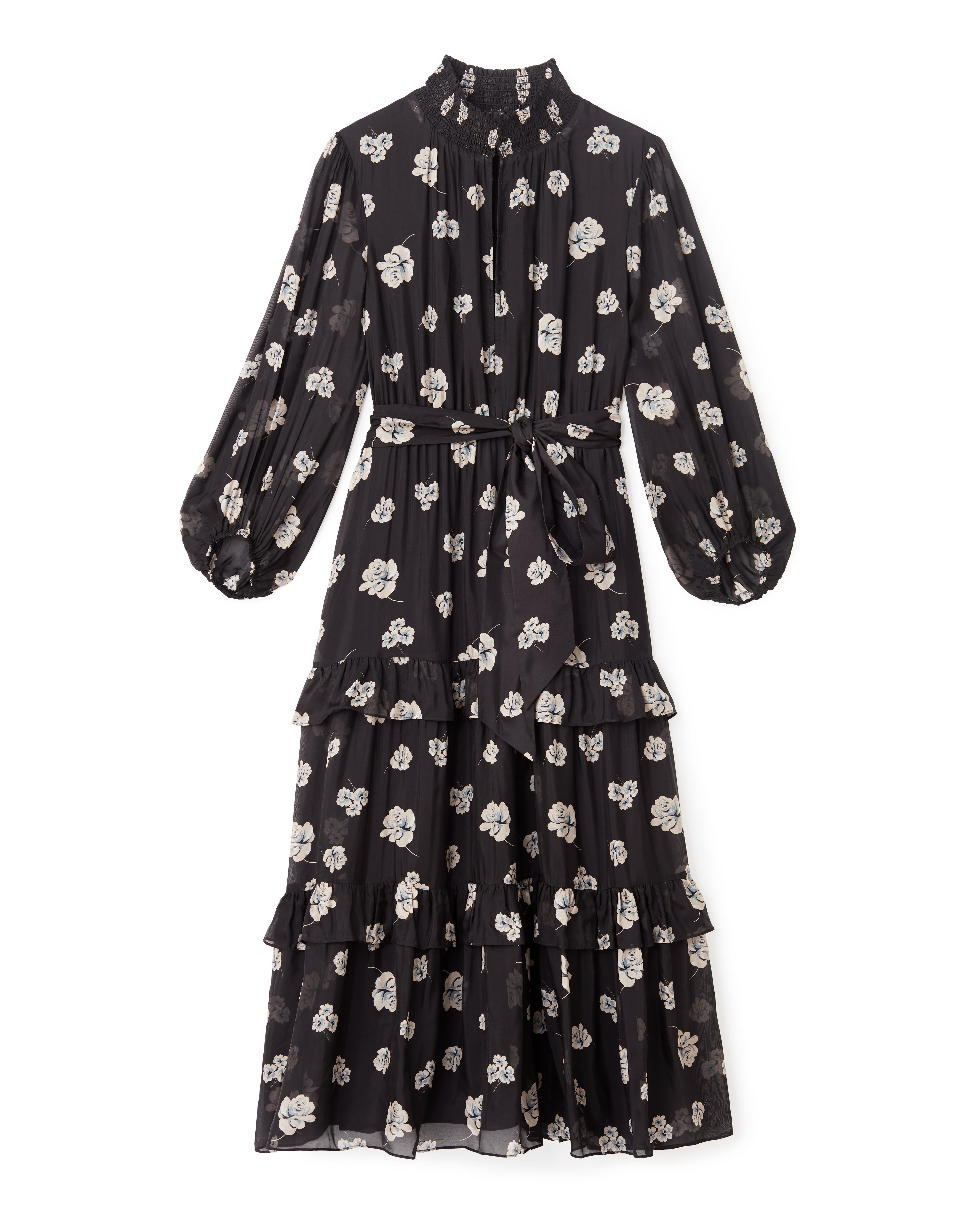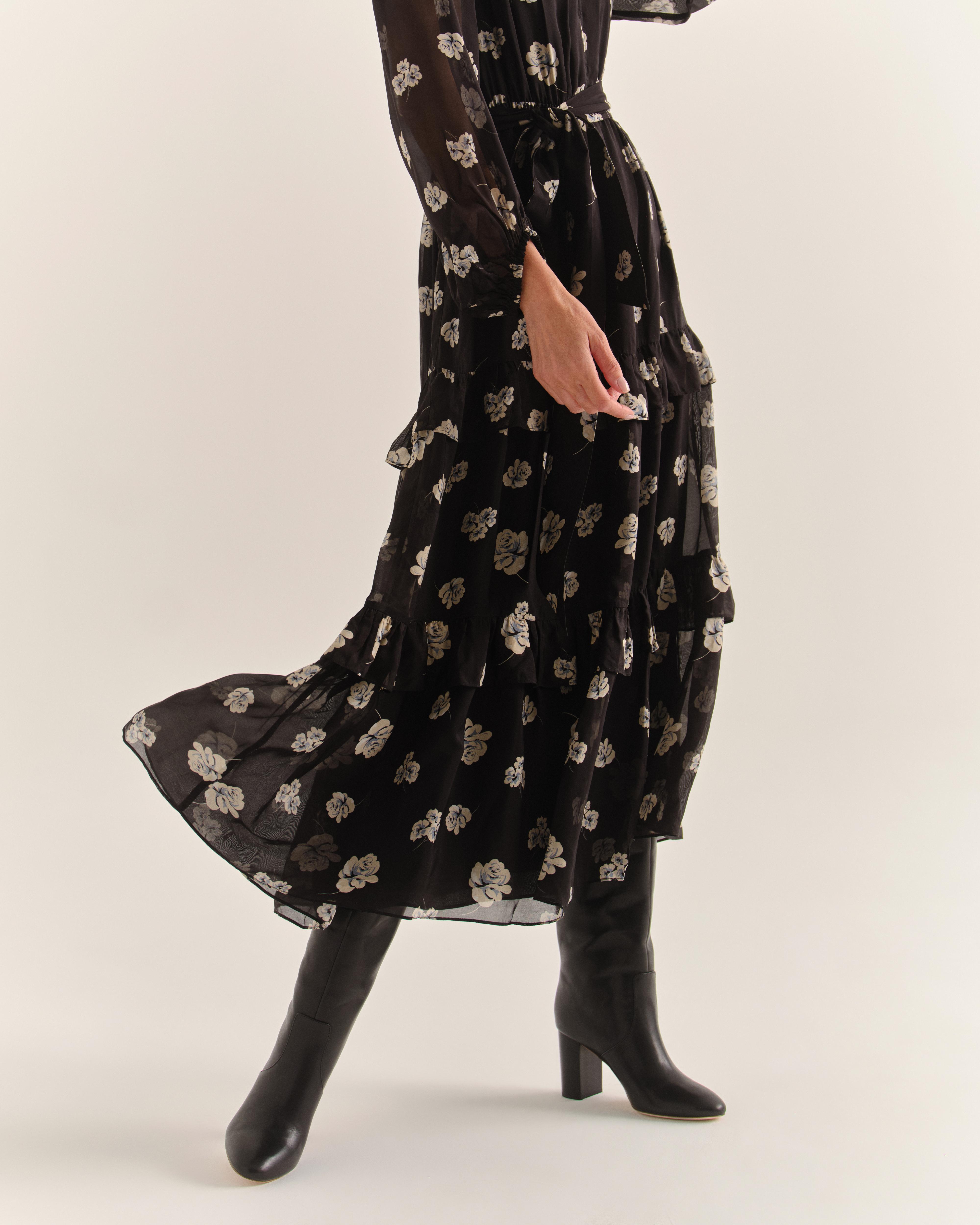 - Sheer silk chiffon with ethereal floral print and tiered flounce hem