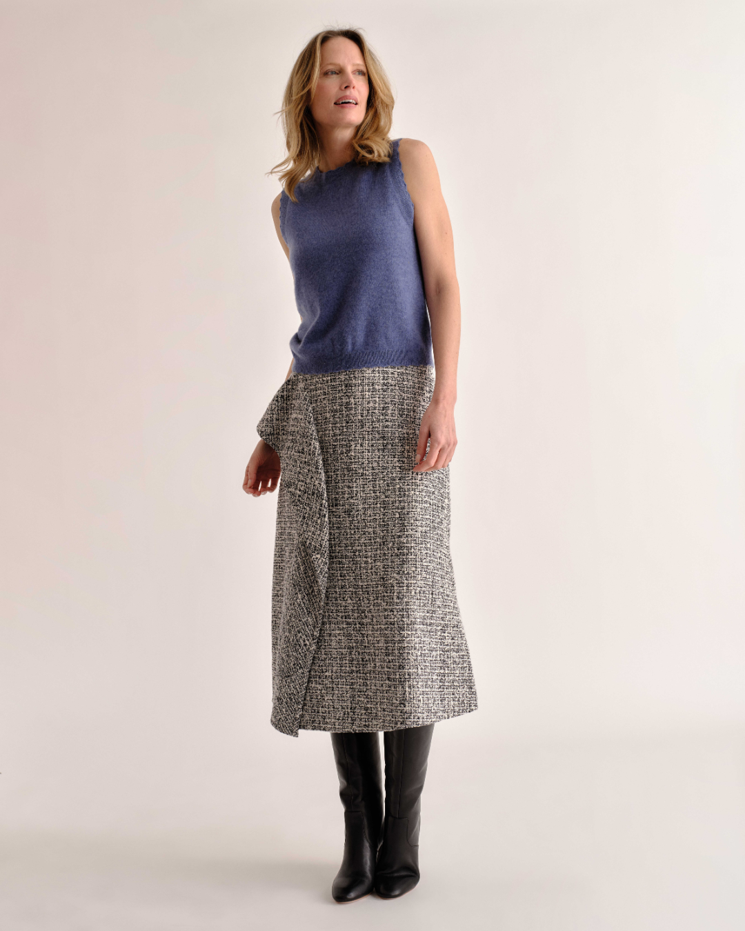 The Lou cashmere crewneck shell is an essential sweater to pair with its matching pearl buttoned cardigan or wear on its own. A  ribbed scalloped trim with modern geometric pattern and zigzag edge elevates this basic to must have status.