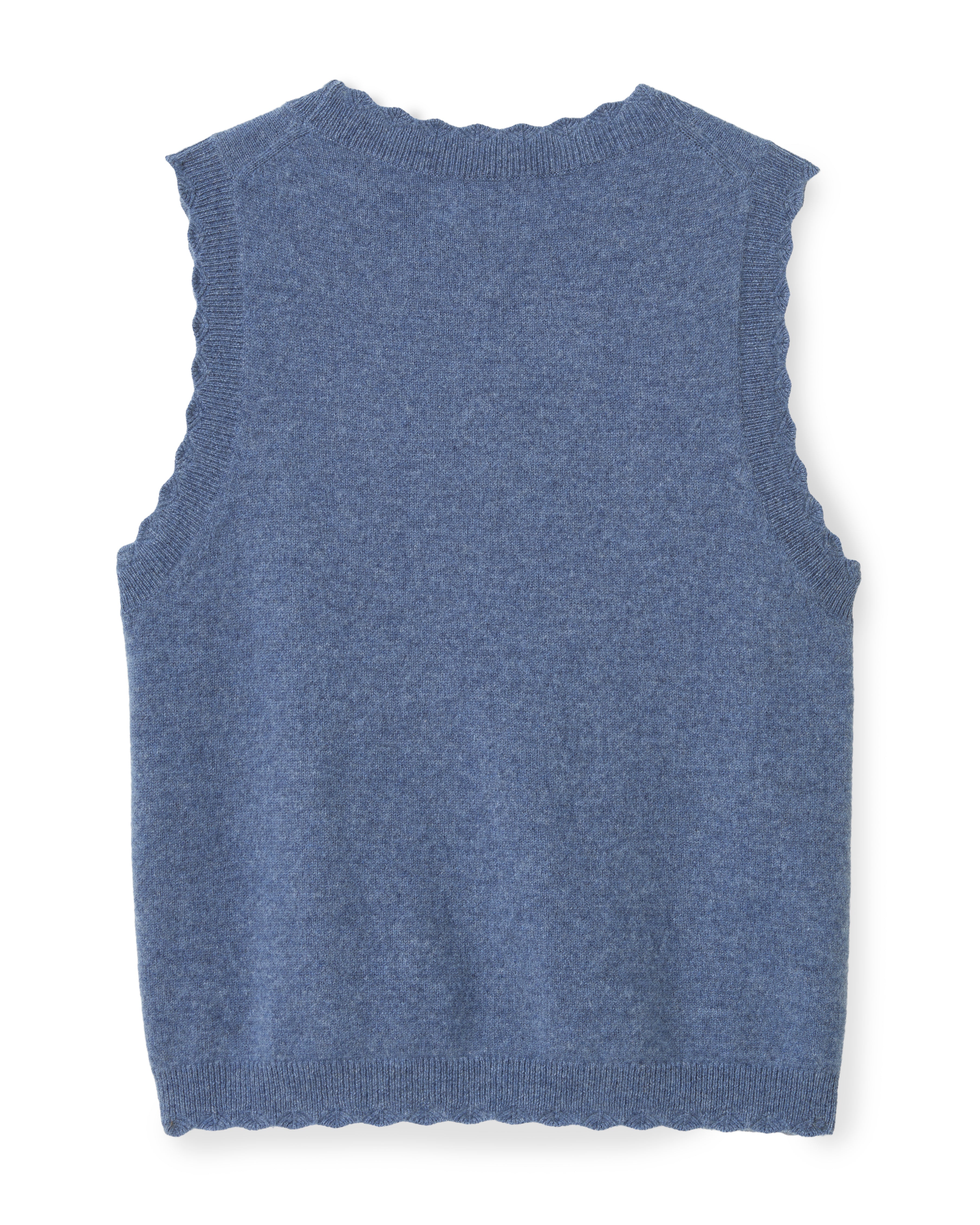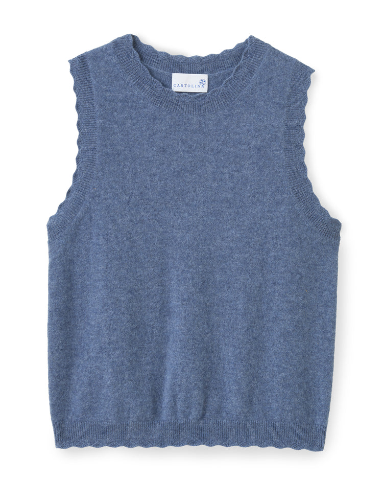 The Lou cashmere crewneck shell is an essential sweater to pair with its matching pearl buttoned cardigan or wear on its own. A ribbed scalloped trim with modern geometric pattern and zigzag edge elevates this basic to must have status.