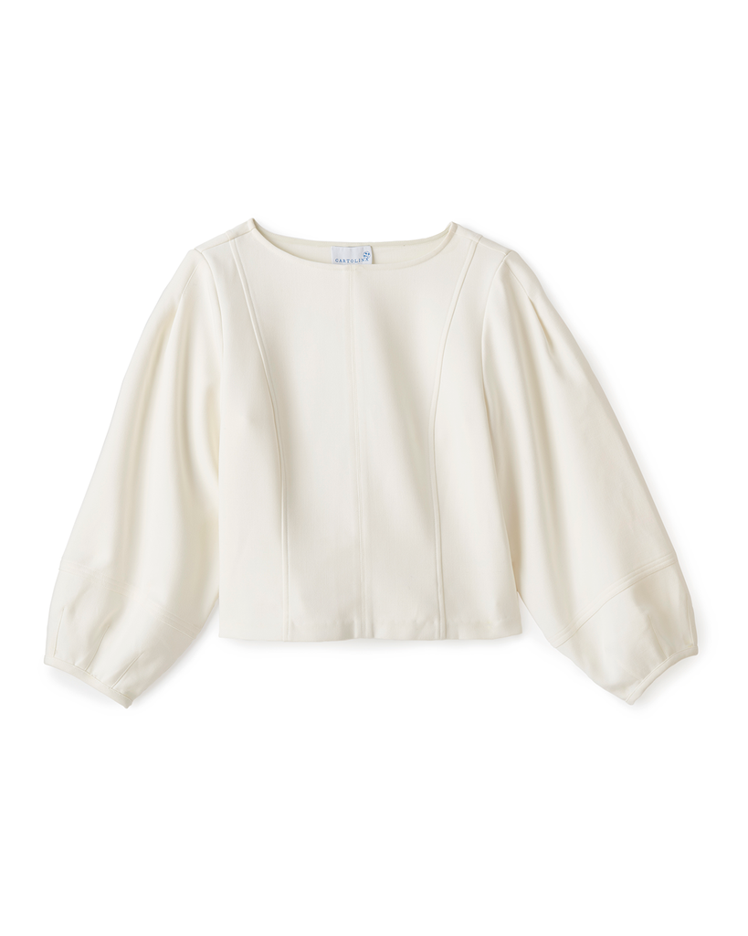 Architectural in silhouette and soft in feel, this crepe top frames the neckline with sculptural pleats. Its refined boatneck silhouette makes it equally suited to office hours and special occasions.