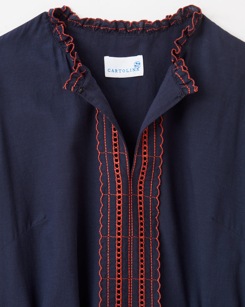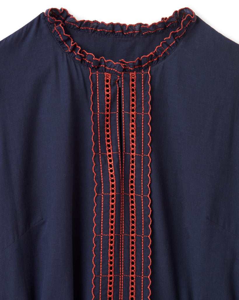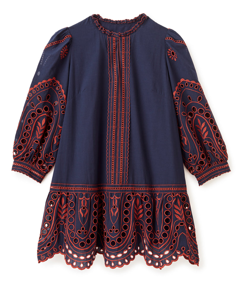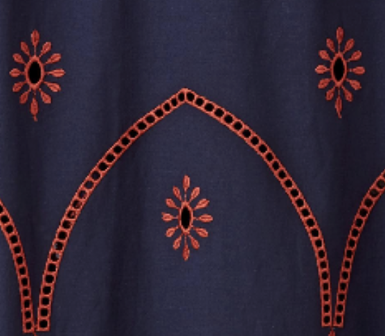 • Contrast eyelet embroidery with exaggerated scalloped hem