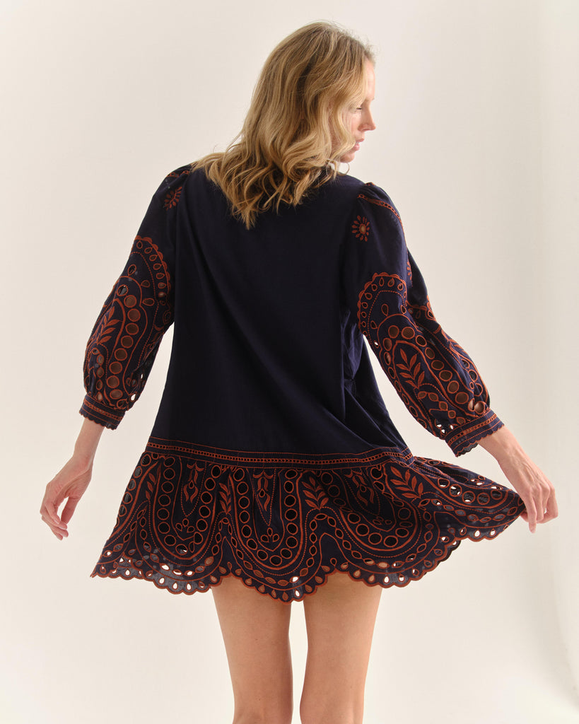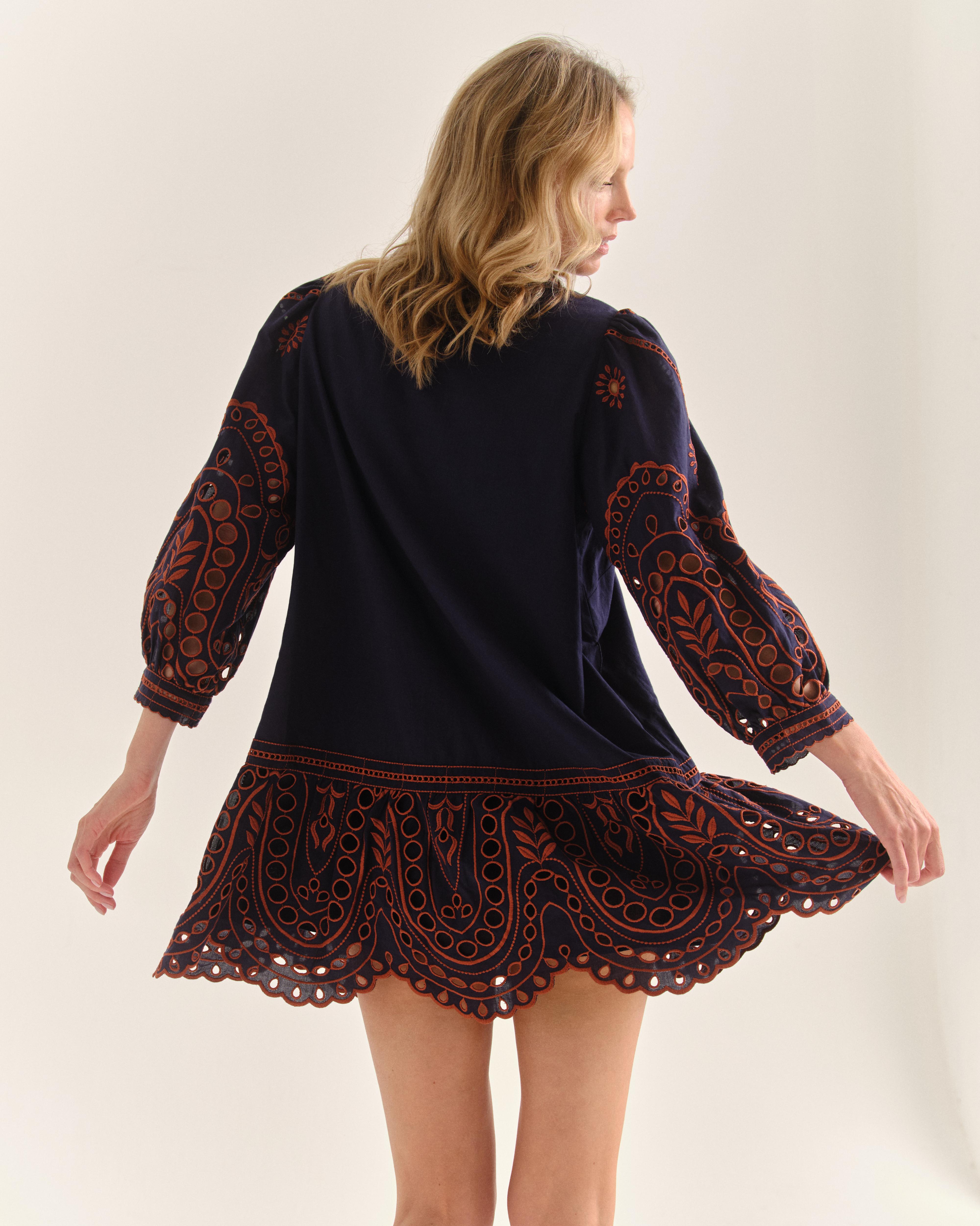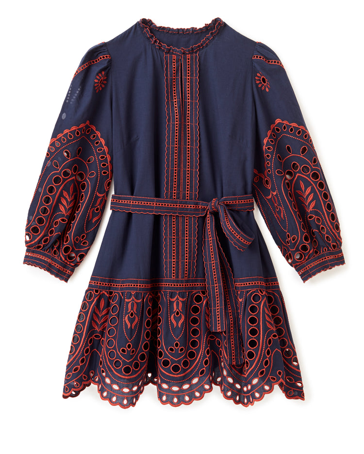 Designed for moments that call for playful romance, this embroidered mini dress has a playful personality thanks to scalloped ruffles, puff sleeves, and a detachable sash for versatile styling. A piece that moves as beautifully as it looks.