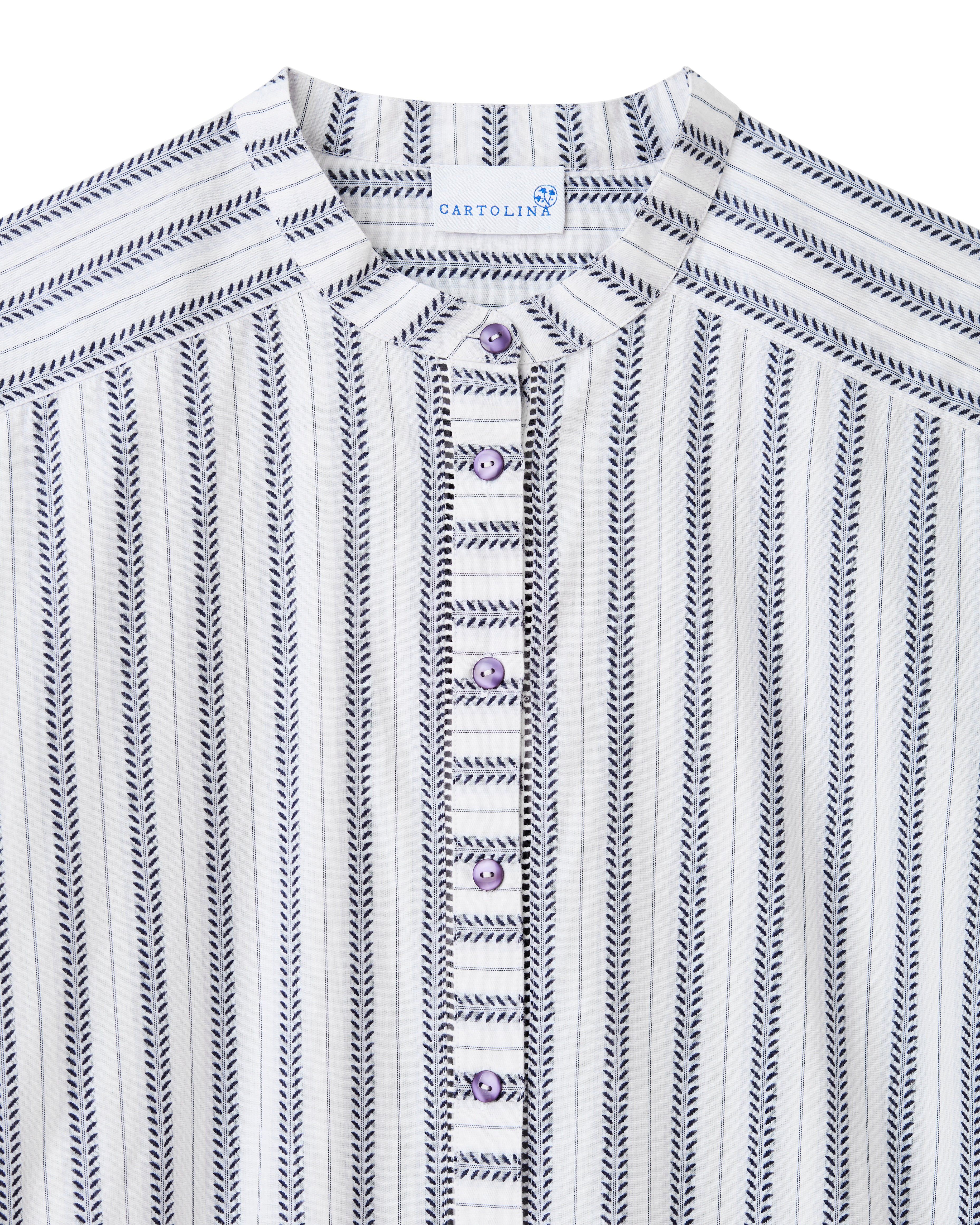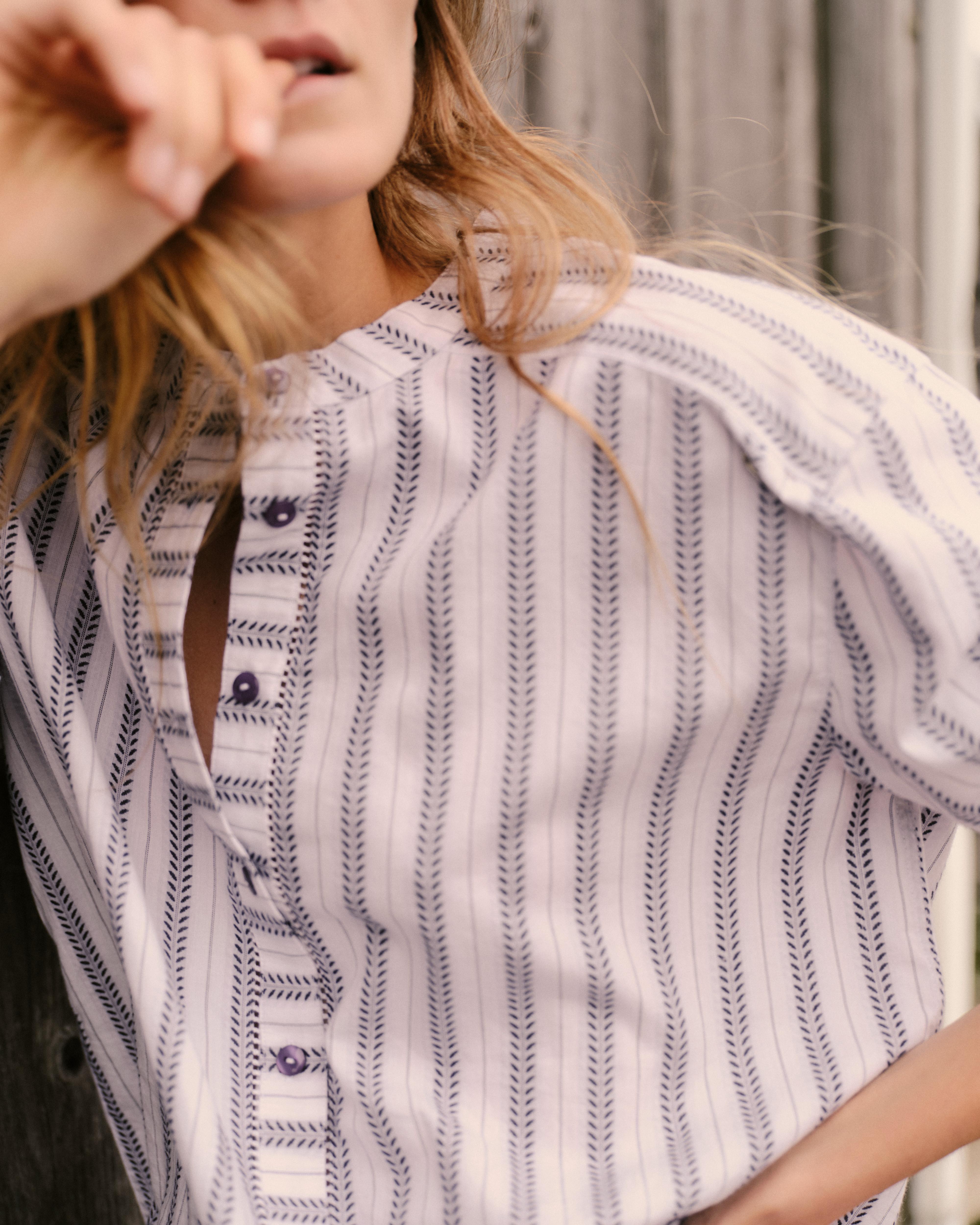 For work, play or travel, the Rosalie button down shirt in cotton voile with jacquard vine stripe will take you anywhere. Pair with denim or the Mia pant. Tuck into the Maris skort for a perfect matching set.