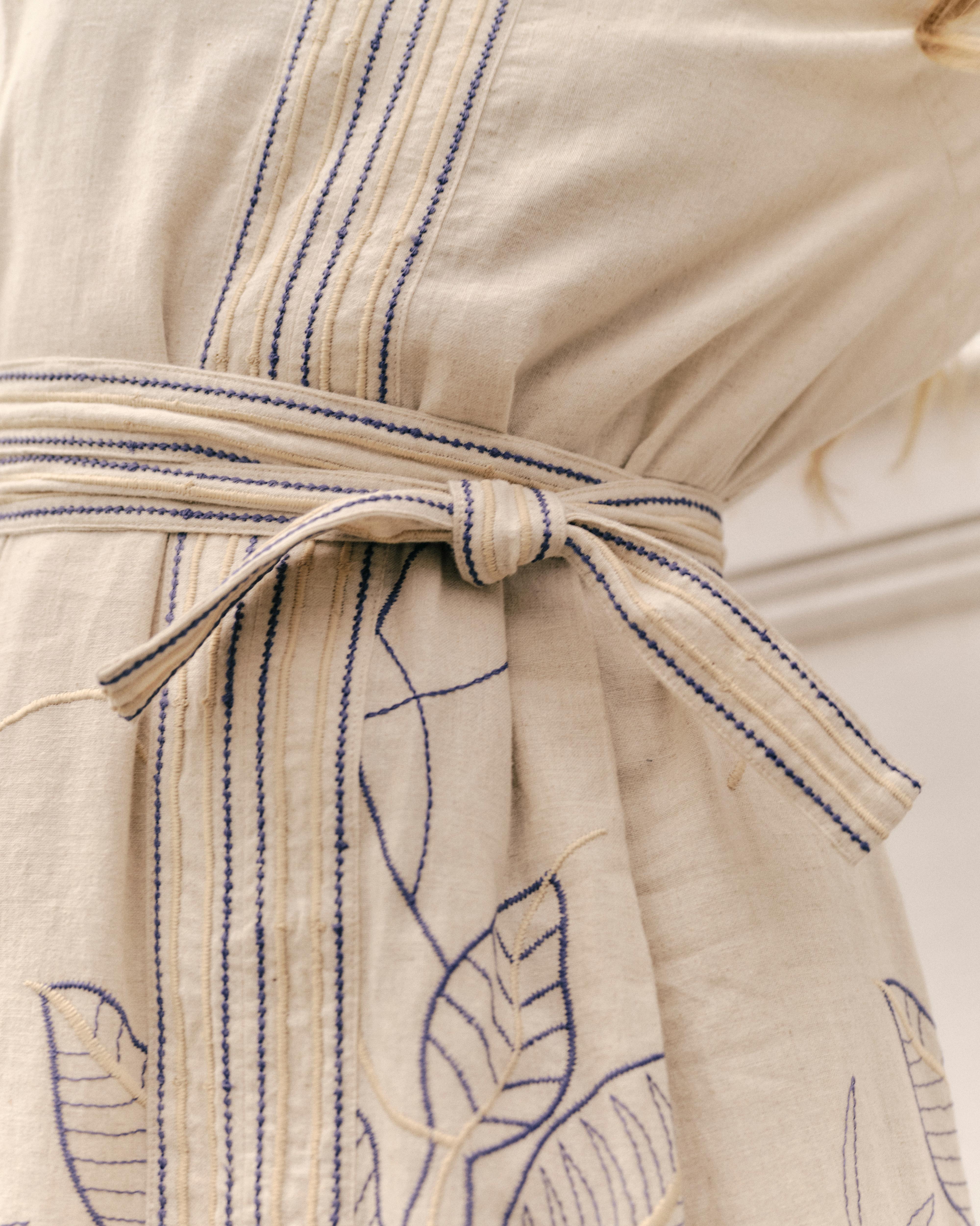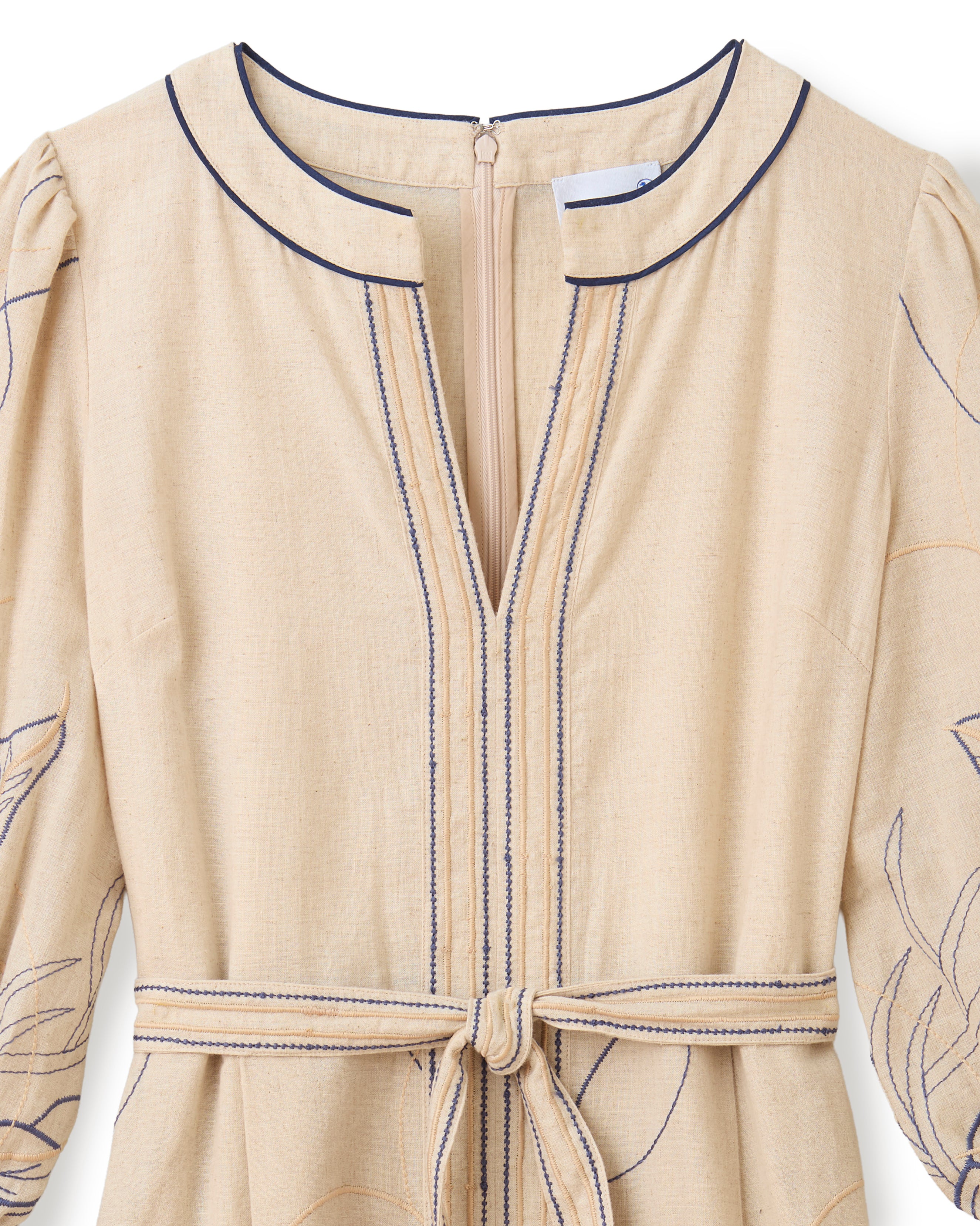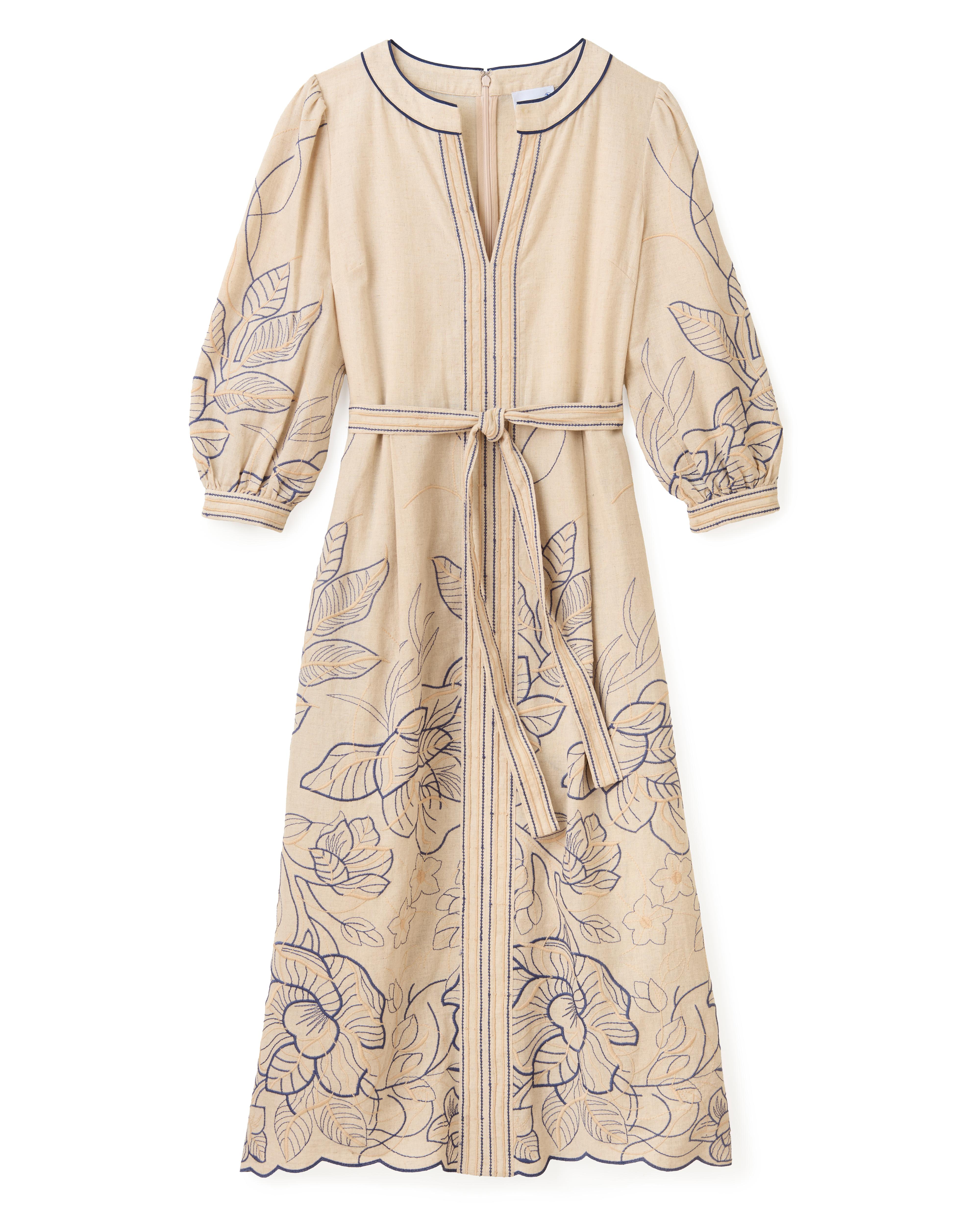 Ease into the Spring with the Sandy pullover embroidered midi-length dress in natural cotton linen.