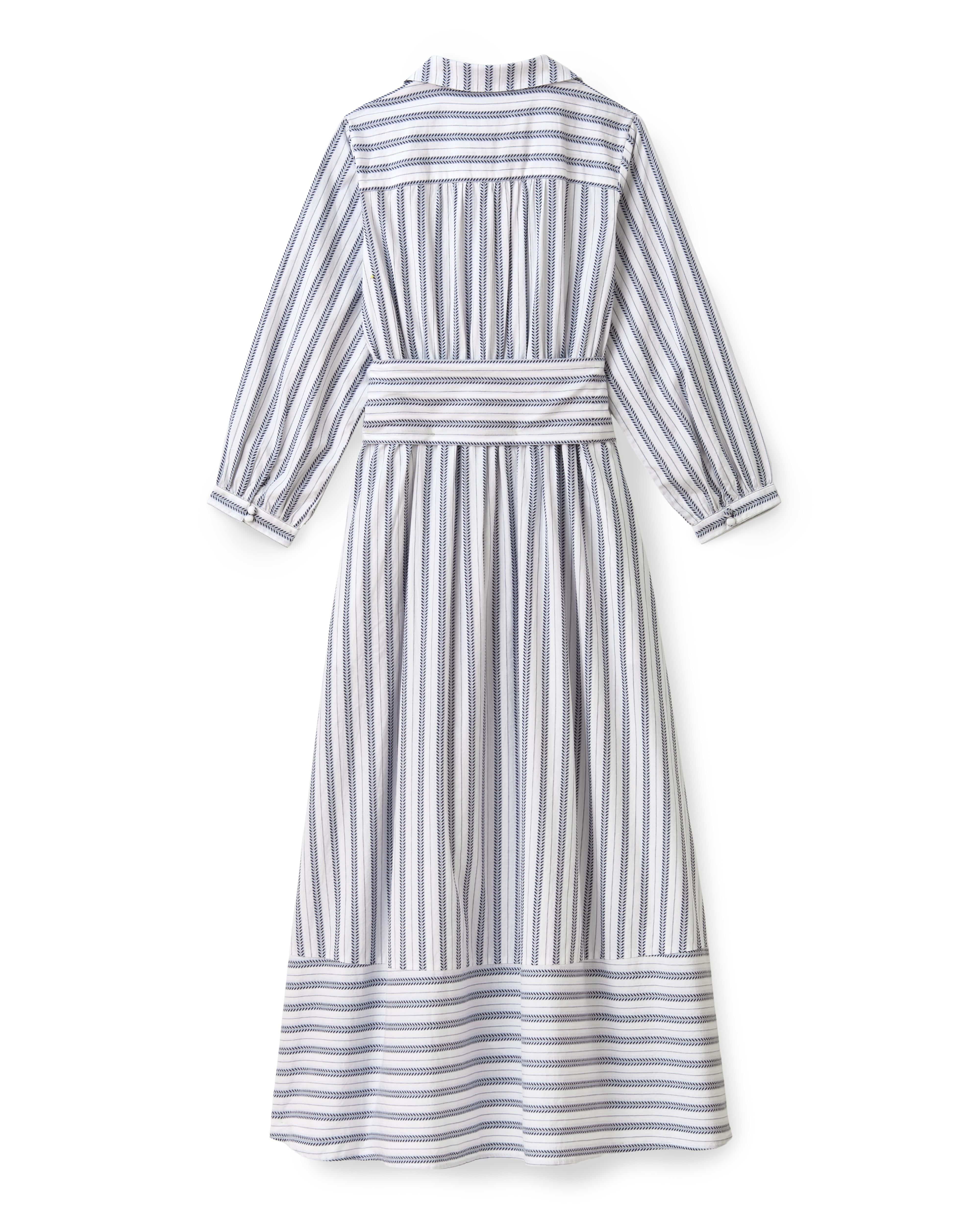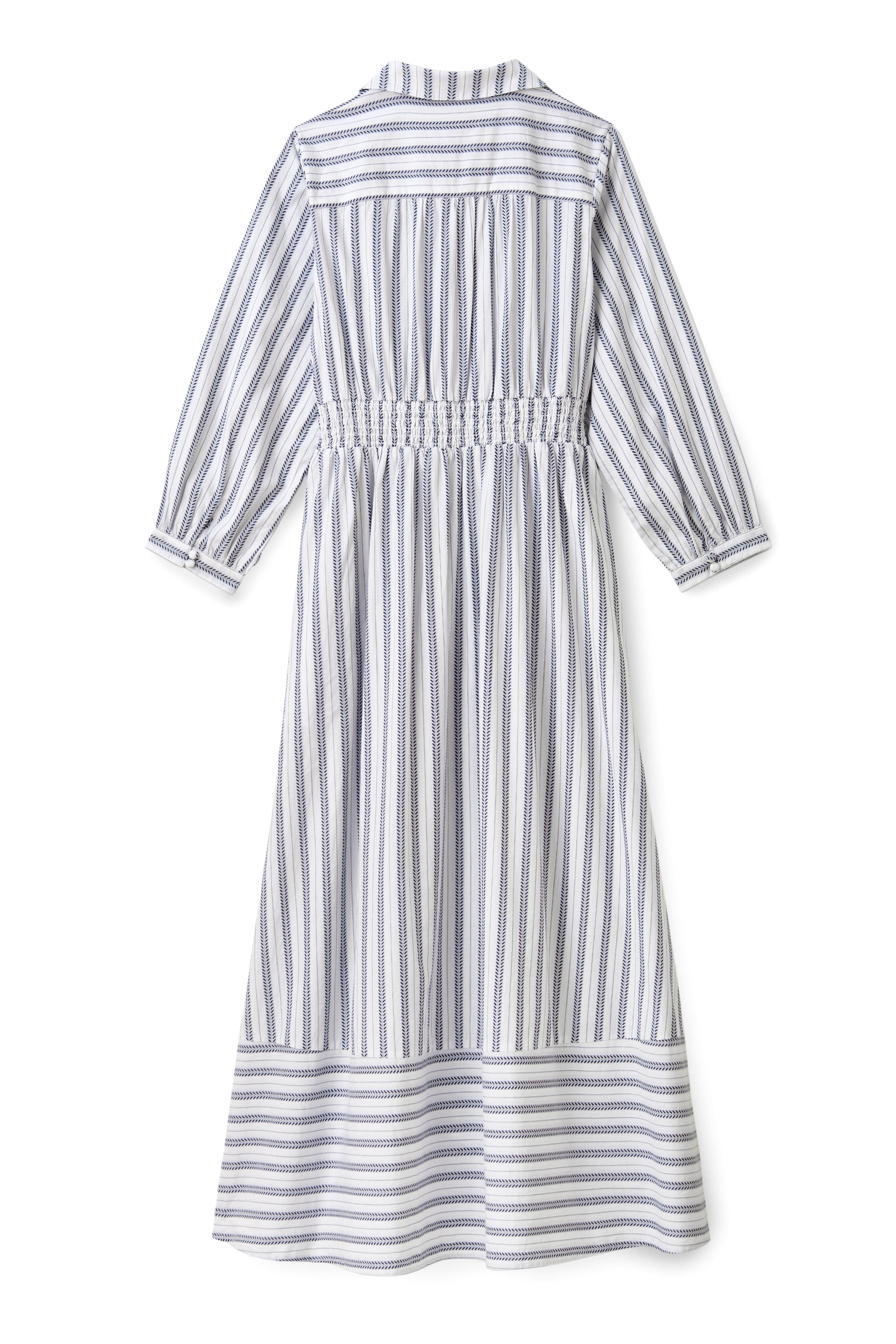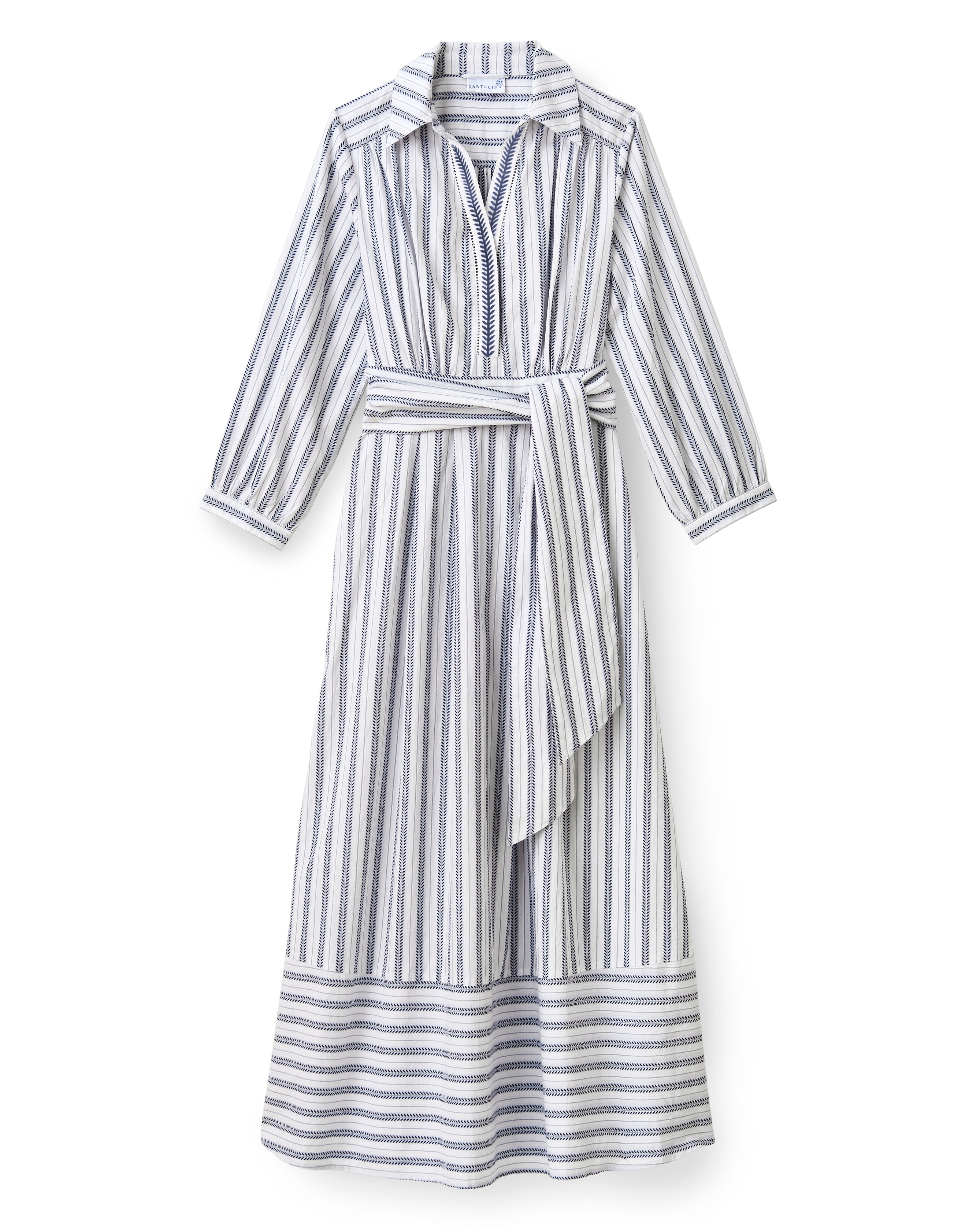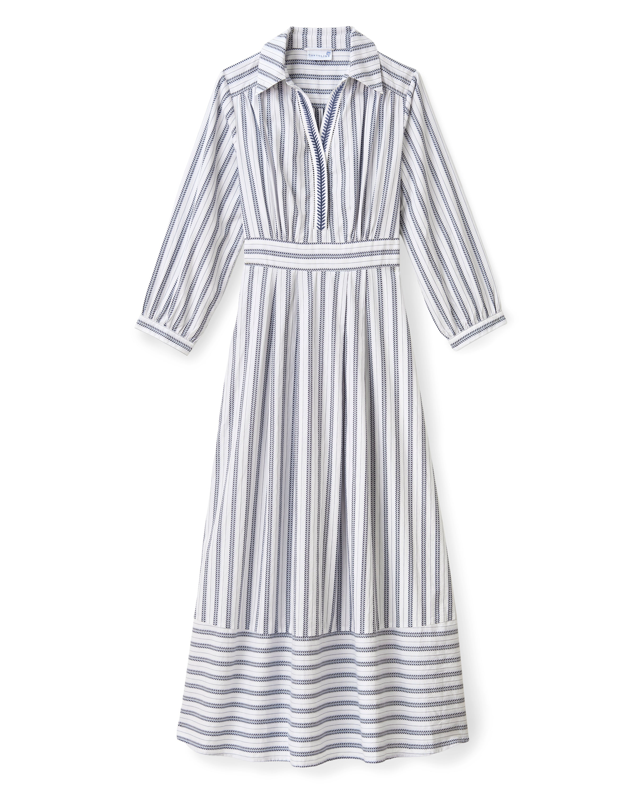 The Seraphina dress touts a cotton voile jacquard vine stripe with navy embroidered vine design down the y-neck center front trim. Perfect for any occasion.