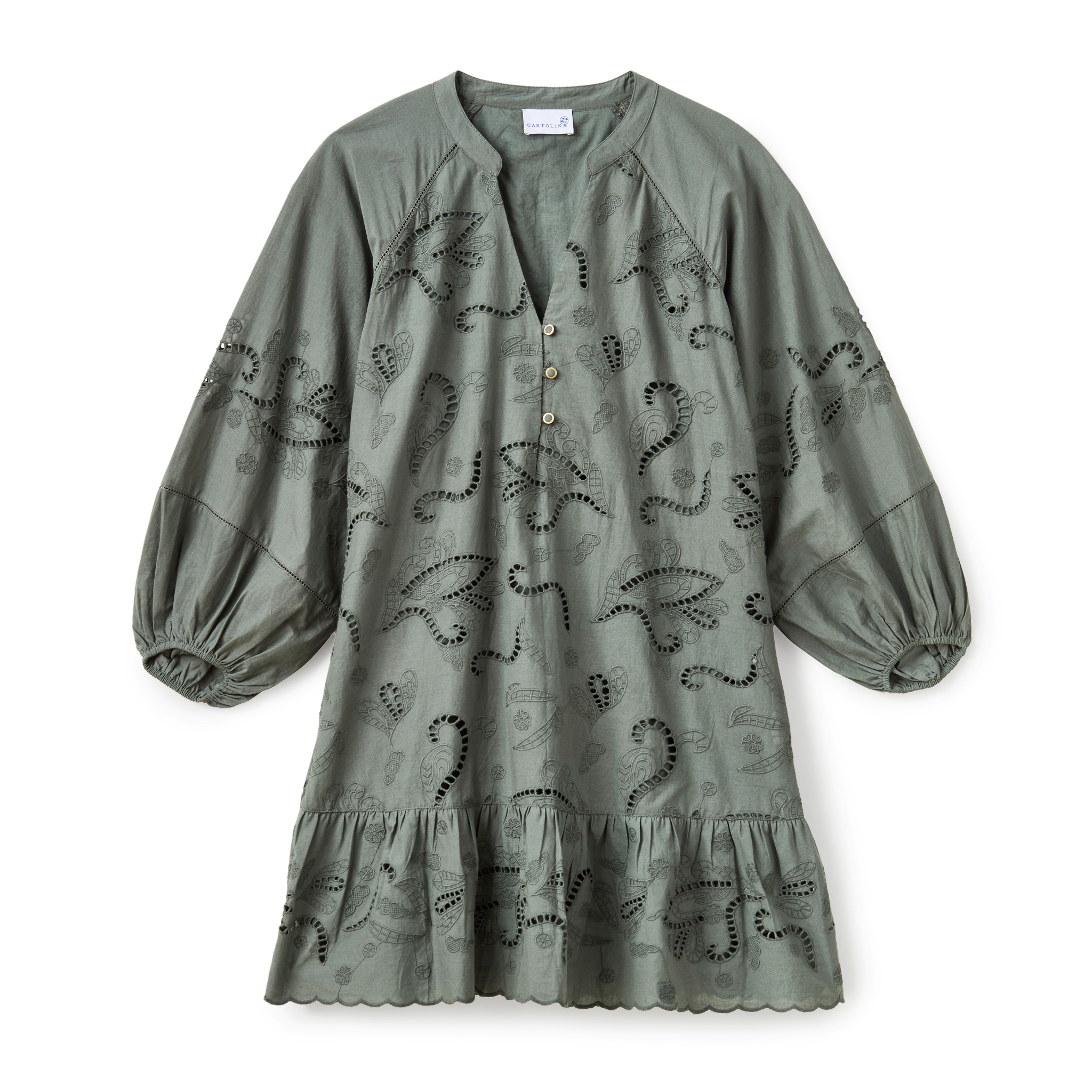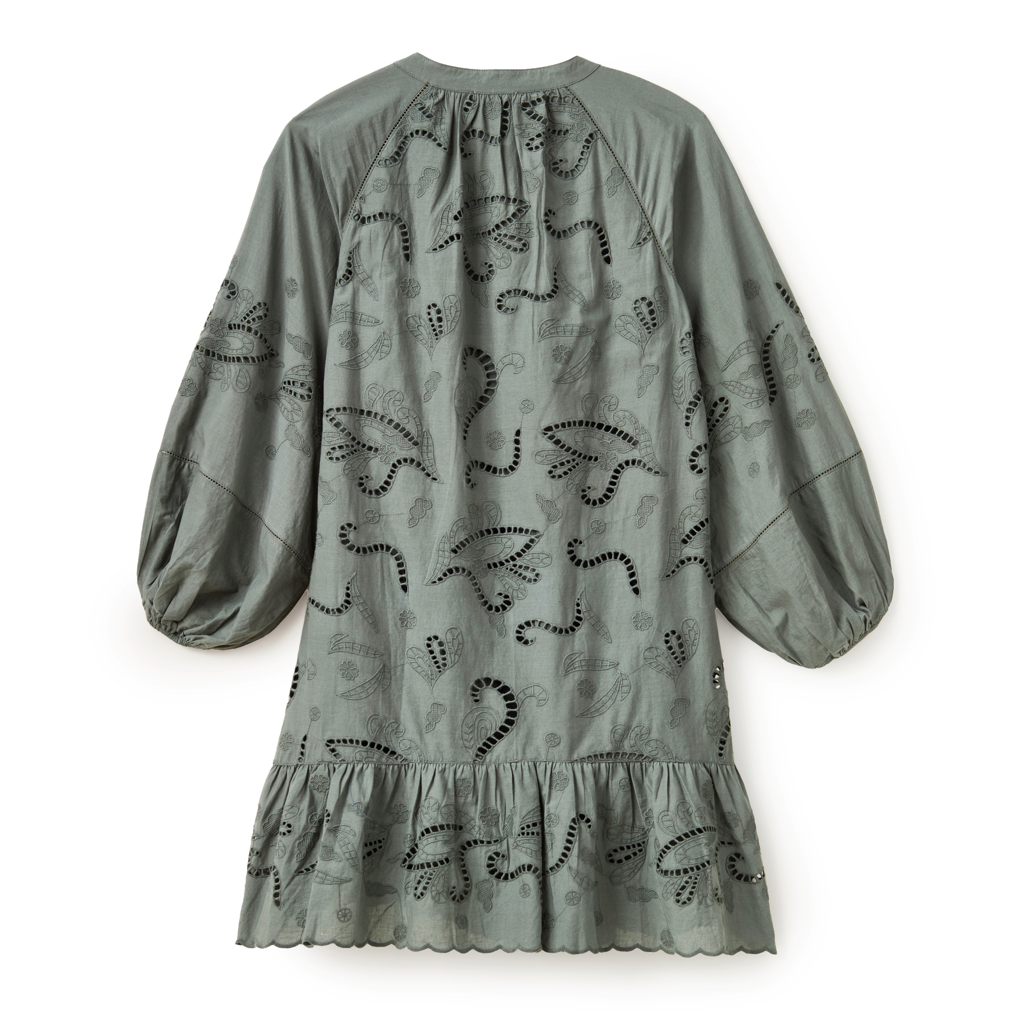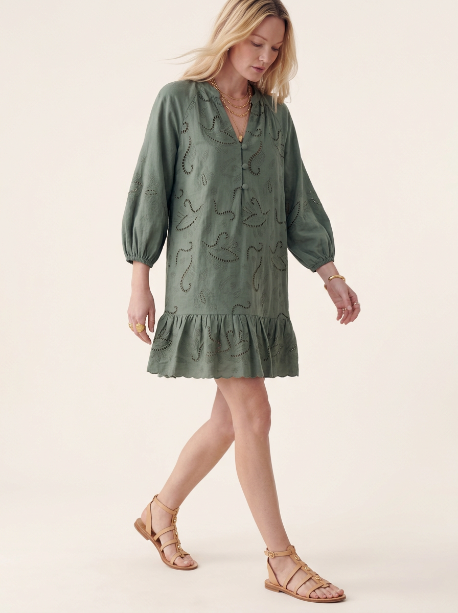 A study in effortless texture, the Selwin Mini mirrors the patterns of coastal flora with its tonal embroidery and delicate lace. Its easy tunic shape and soft lantern sleeves make it an essential layer for the transition from misty mornings to bright spring days.