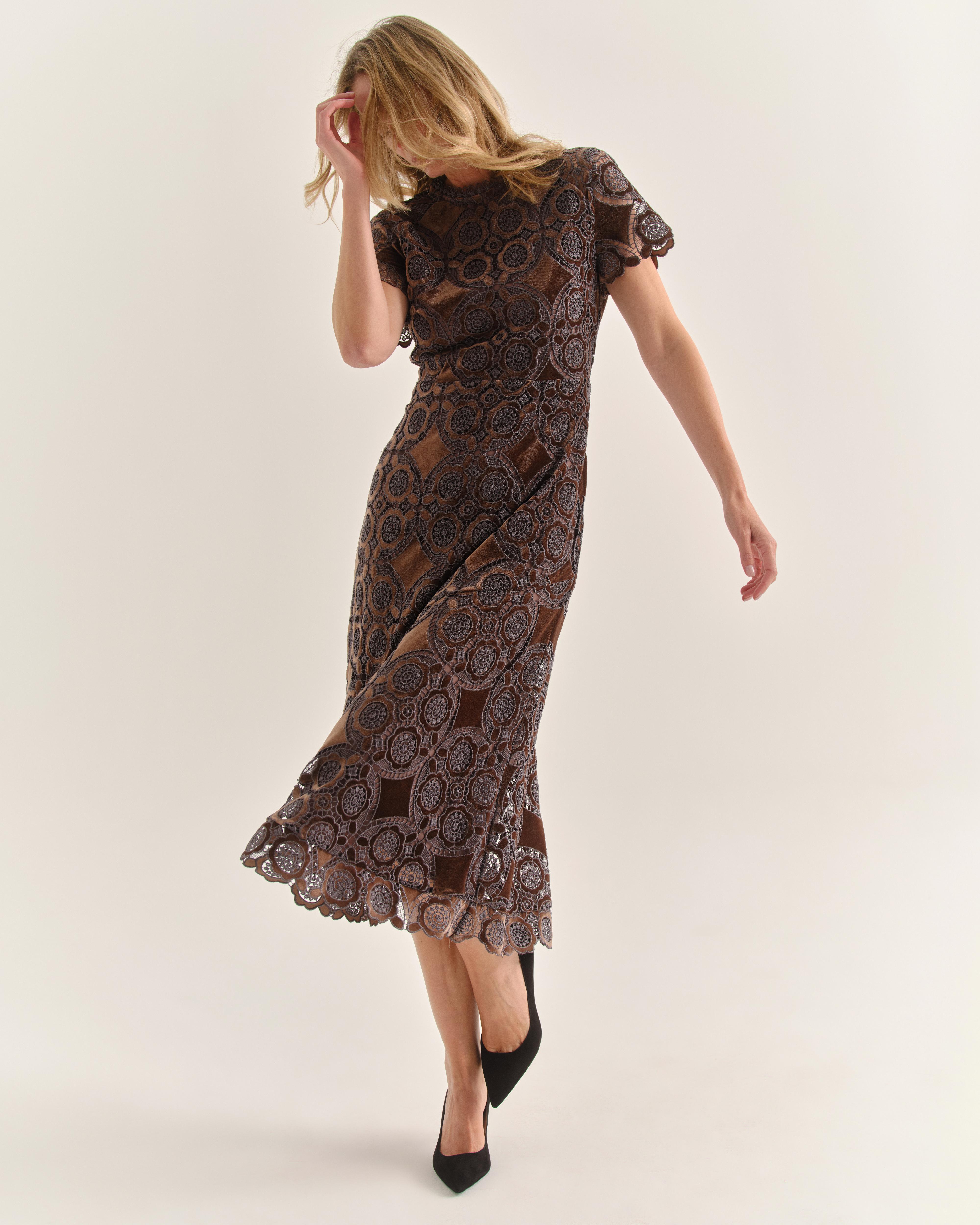 A chic, body-skimming midi-length short sleeve dress made for a variety of this season’s special occasions, from weddings to holiday gatherings. Equal parts romantic and feminine, the soft lux velvet lace makes this style stand out in a crowd.